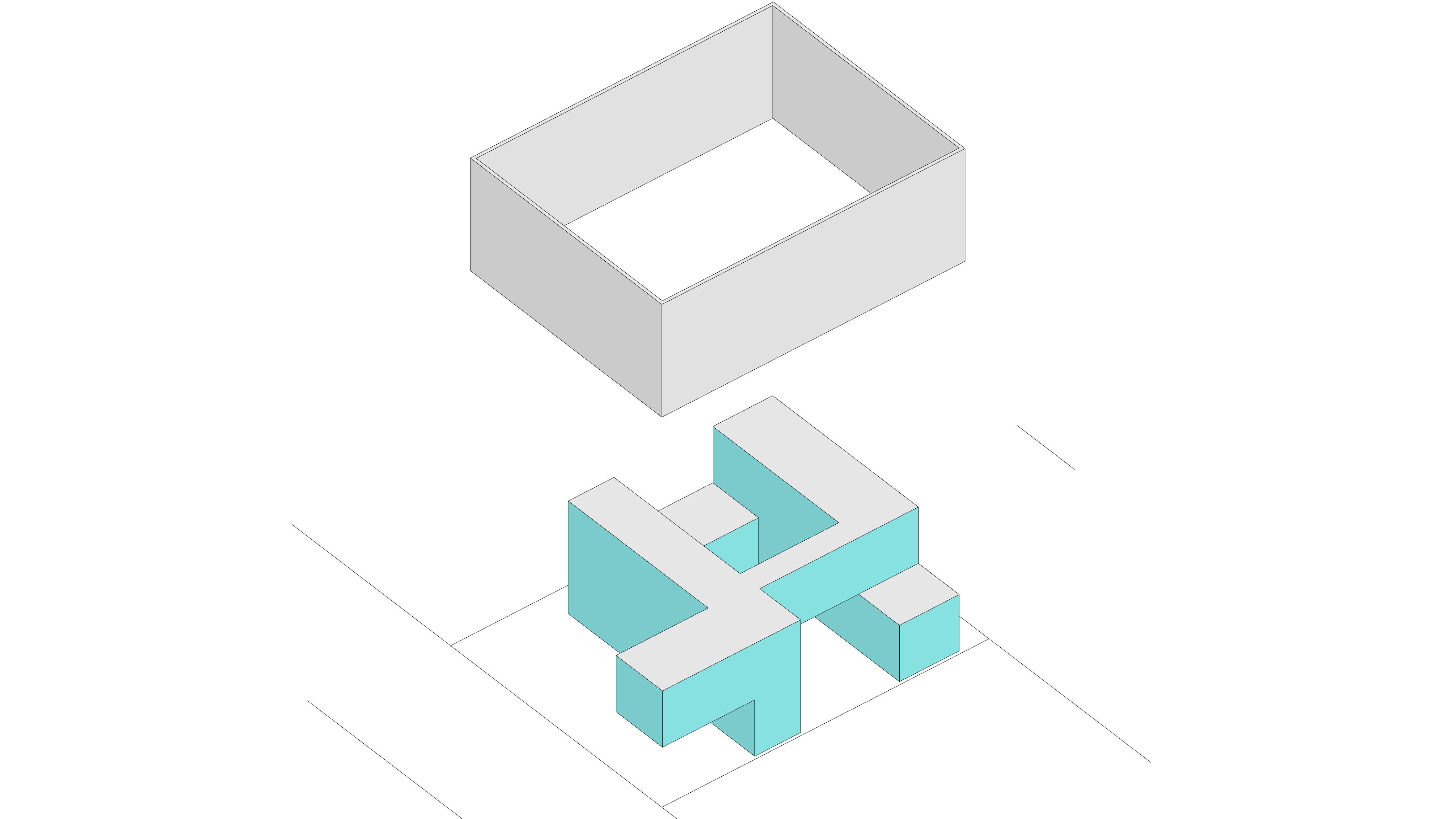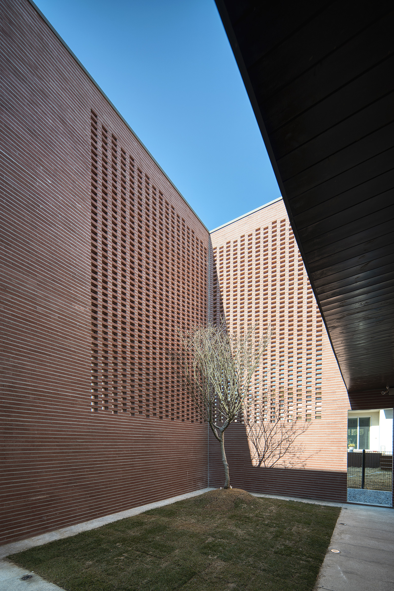The uniform and massive wall at the front is sufficient to attract the attention and curiosity of the surroundings, but it may be difficult to approach easily due to its solid appearance. To mitigate this, a semi-permeable wall is used to neutralize the relationship with the surroundings. The rectangular exposed concrete frame of the entrance is designed to arouse curiosity with a smaller attraction in the context of the massive front. The frame, the only opening in the box, serves as a transitional element between the external and internal spaces. By creating small openings in the robust exterior, the aspiration toward the interior is maximized.