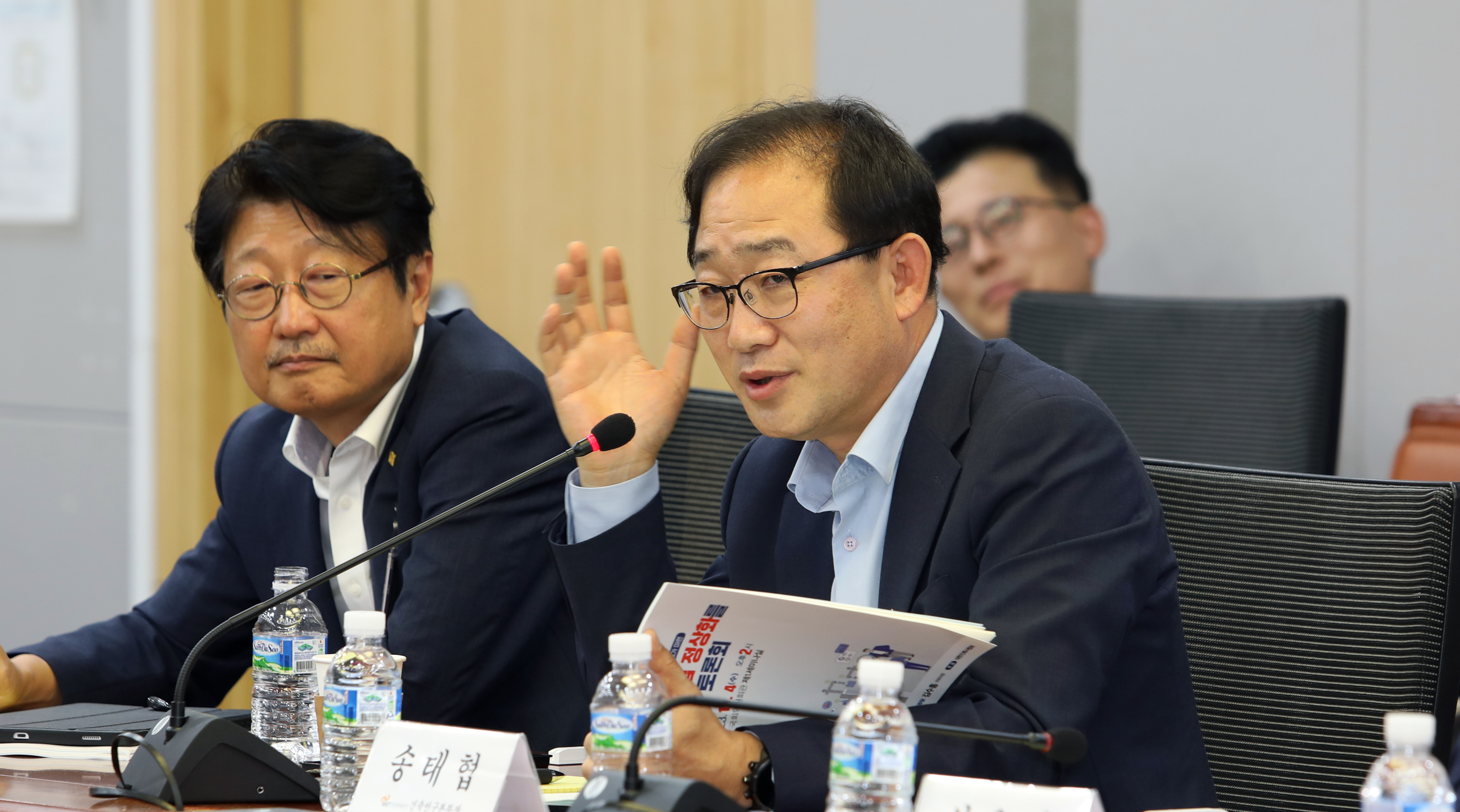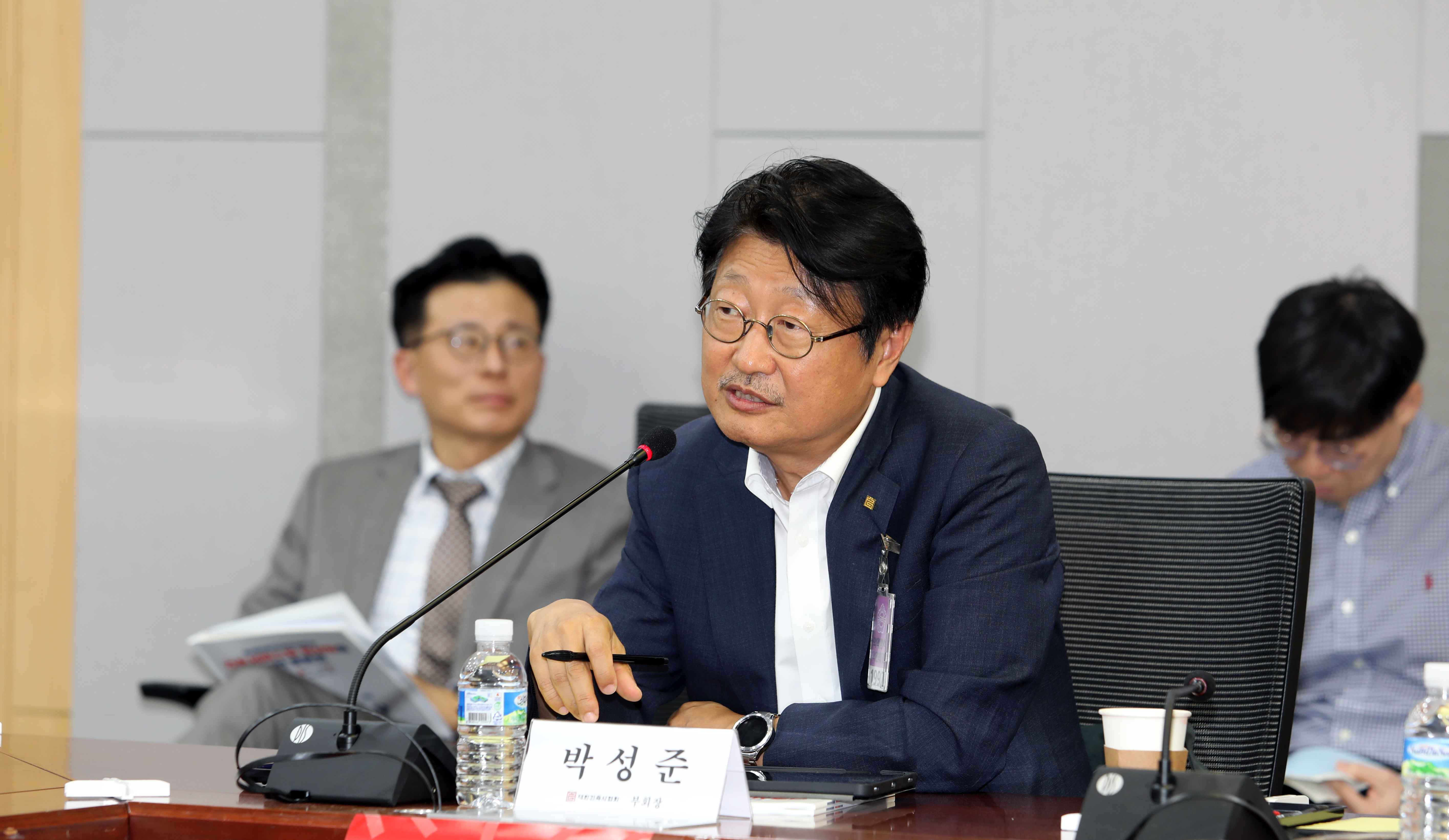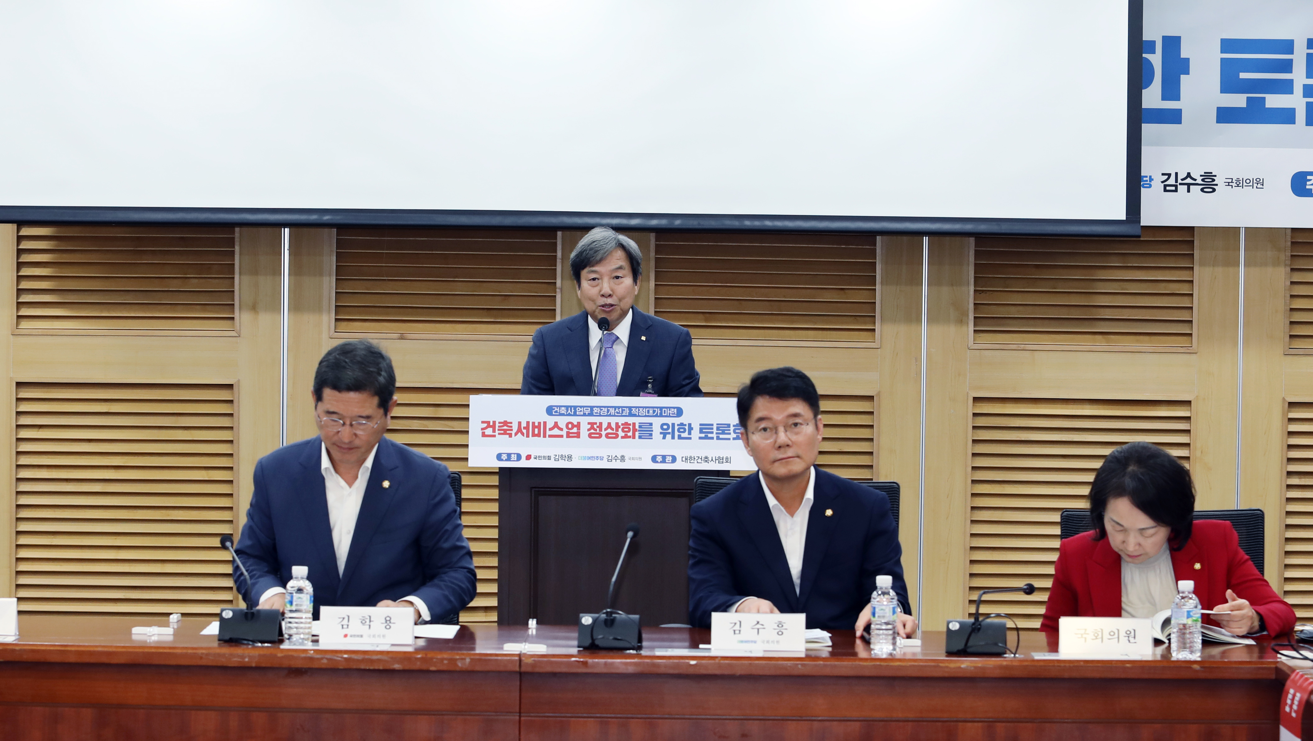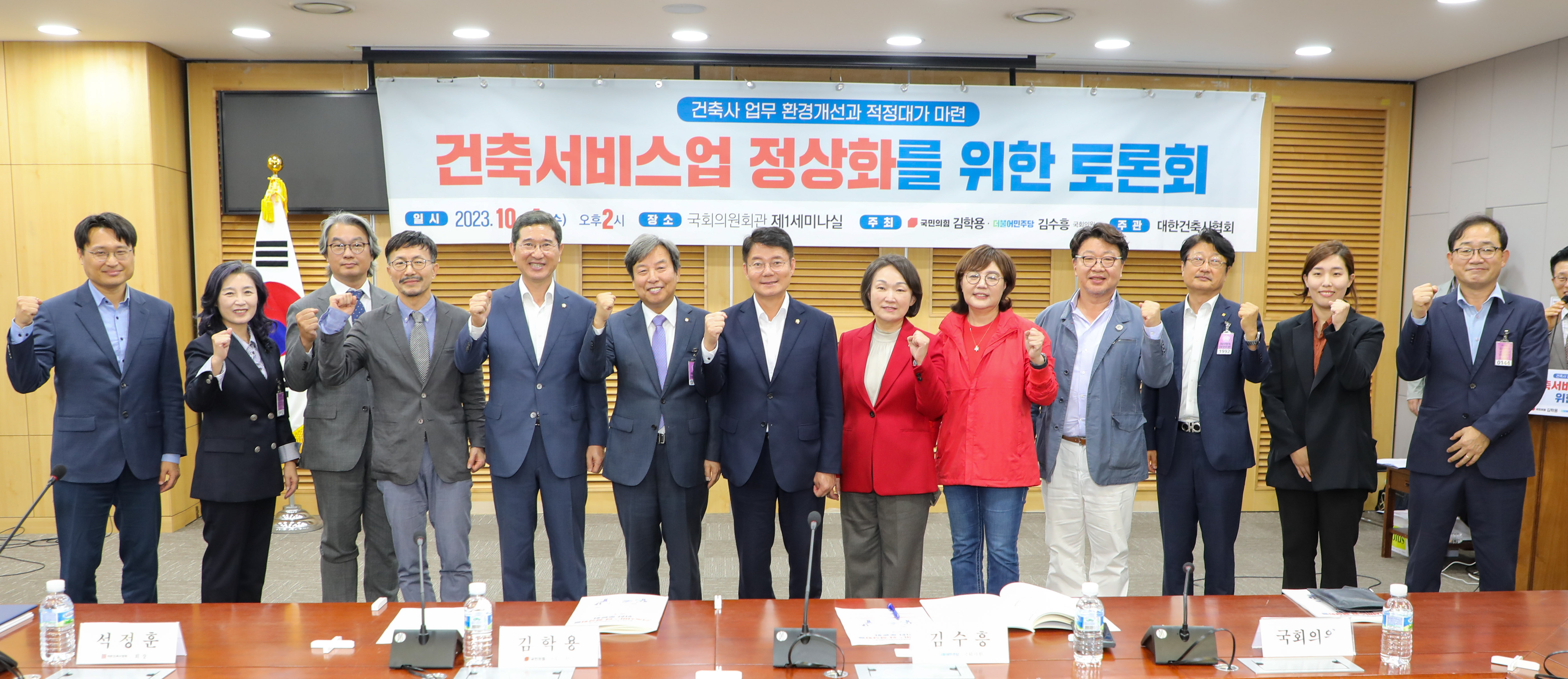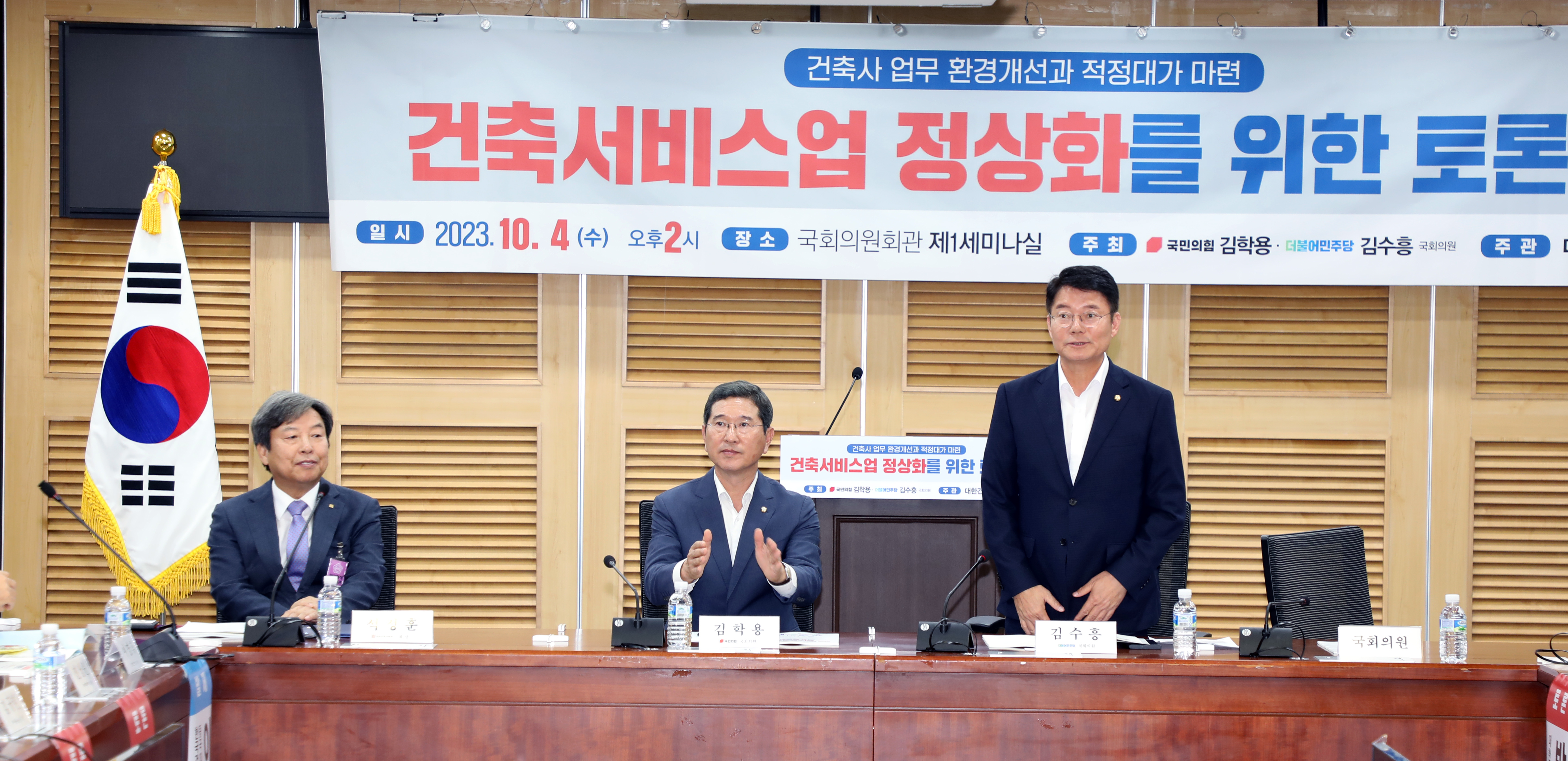 국회 국토교통위원회 소속 김학용·김수흥 국회의원이 공동 주최·주관하는 민간 대가기준 마련을 위한 ‘건축서비스산업 정상화를 위한 국회 토론회’가 지난 10월 4일 국회의원회관 제1세미나실에서 열렸다. (왼쪽부터) 대한건축사협회 석정훈 회장, 김학용 국회의원, 김수흥 국회의원