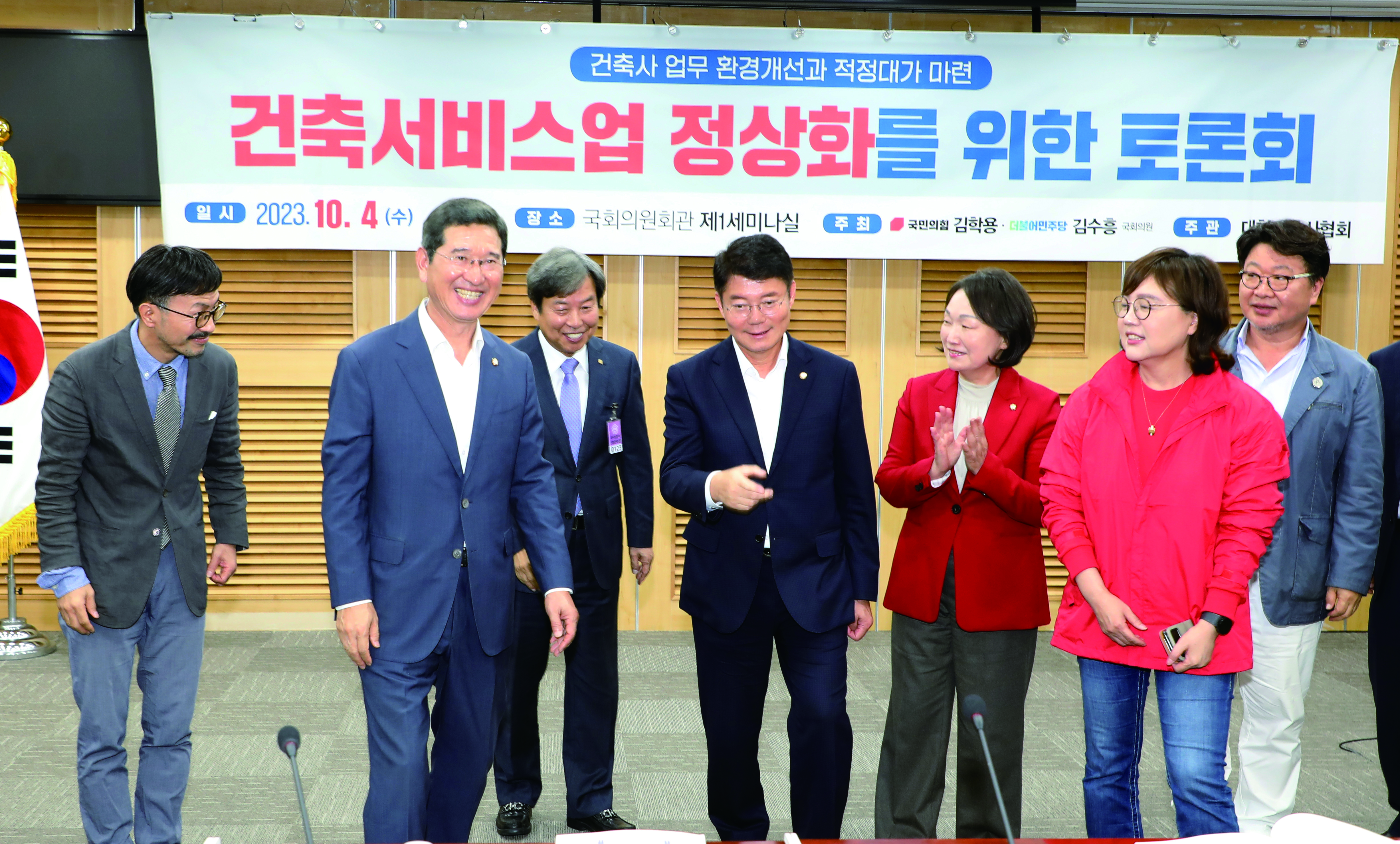 지난 10월 4일 열린 ‘건축서비스업 정상화를 위한 토론회’에서 국회 국토교통위원회 의원을 비롯한 토론자들이 자리를 함께하고 있다. (왼쪽부터) 한국건축정책학회 이명식 회장, 김학용 국회의원, 대한건축사협회 석정훈 회장, 김수흥 국회의원, 한무경 국회의원, 양금희 국회의원, 한국건축가협회 한영근 수석부회장