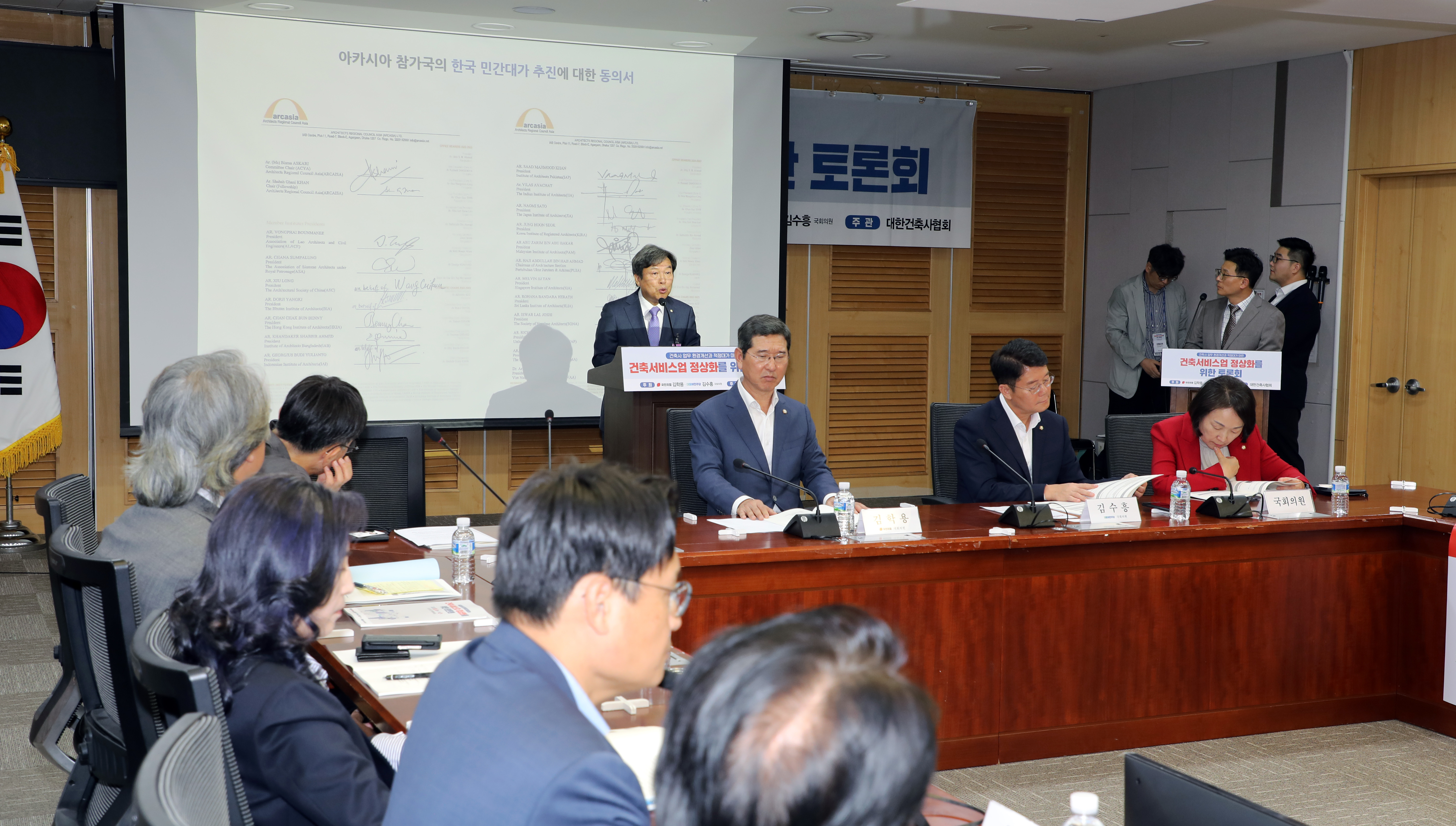 대한건축사협회가 추진하는 민간대가 법제화에 중국, 일본, 싱가포르, 인도네시아 등 22개국 아시아건축사협의회 건축사단체 회장을 비롯한 아카시아 임원 및 각 위원회 위원장, 역대회장들이 지지를 표하는 서명을 하며 함께했다. 사진은 아시아건축사협의회 22개 회원국의 지지 공동성명서.