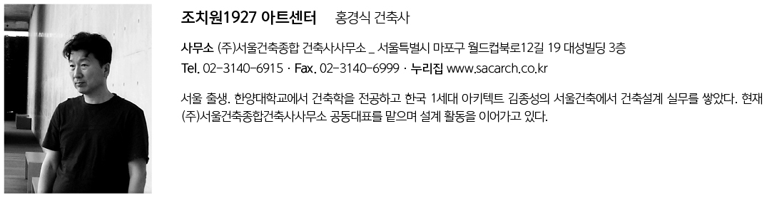 조치원 1927 아트센터 설계자 | 홍경식 _ (주)서울건축종합 건축사사무소 시공자 | (주)장벽종합건설 건축주 | 세종특별자치시 설계팀 | 나오식, 김진묵, 김봉주, 박연인, 엄유빈 대지위치 | 세종특별자치시 조치원읍 새내4길 17 주요용도 | 문화집회시설, 근린생활시설 대지면적 | 6,169.00㎡ 건축면적 | 1,614.00㎡(기존 1,061㎡) 연면적 | 1,703.00㎡(기존 1,111㎡) 건폐율 | 26.17% 용적률 | 27.61% 규모 | 2F 구조 | 철골조, 철근콘크리트조, 목조 외부마감재 | 내후성강판, 징크, 알루미늄복합패널, 치장벽돌 내부마감재 | 내후성강판, CRC보드, 콘크리트폴리싱, 논슬립자기질타일, 목모보드, 수성페인트, 세라믹계뿜칠 설계기간 | 2021. 03 – 2021. 07 공사기간 | 2021. 09 – 2022. 06 사진 | 임준영 구조분야 | CS구조엔지니어링 기계설비분야 | 하나기연 전기분야 | 하나기연 소방분야 | 하나기연 |