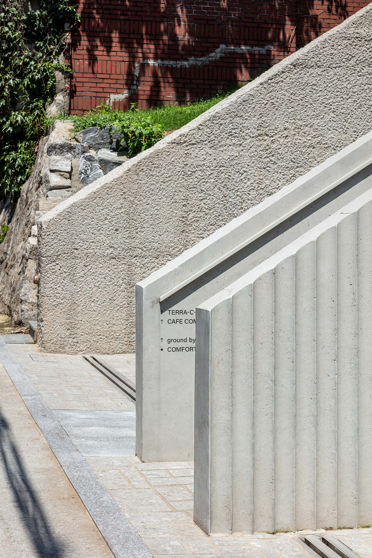 이 공간이 100년이 넘는 오랜 시간 동안 도시에서 의미 있는 장소가 되길 바랐고, 그러기 위해 긴 시간 동안 설득력 있는 재료와 다양한 변화에 잘 대응할 수 있는 형태와 질감을 갖길 원했다. 이를 위해 노출콘크리트의 거푸집을 활용, 형태와 리듬감을 고려하여 계단, 슬라브, 옹벽의 질감을 결정했다. 먼저 공간의 중심적인 역할을 하는 계단은 EPS 제작 거푸집을 활용했다. 세로의 곡선 음각을 조밀하게 배치하여 음영이 만들어주는 수직성과 리듬감에 주목했다. 각 층의 공간은 수평 슬라브를 강조하기 위해 돌출된 처마를 디자인했다. 그리고 PET 합판을 활용해 담백하게 표현하여 전체적으로 수평선의 리듬감이 수직 계단과 입체적으로 만나길 기대했다. 건물을 감싸는 옹벽은 콘크리트를 쪼아내어 기존 지형이 가진 거친 성격을 드러냈다.