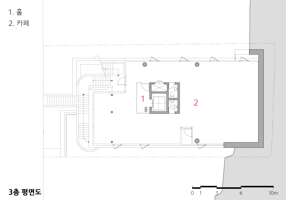 지하 1층은 기존의 지형을 활용해 높은 층고와 전면 유리 파사드를 계획했다. 지하층 위로는 가운데 계단을 기준으로 1층과 2층에서 반반씩 활용한다. 지형의 단차와 부피를 활용해 1층의 복층 공간, 2층의 외부 마당과 연결된 층고 높은 공간을 구성했다. 1층에서는 외부 계단이 풍경이 되고, 2층은 골목길의 모습이 공간의 분위기를 만든다. 3층은 전면 시야를 개방해 서울 풍경을 적극적으로 즐길 수 있도록 했다.