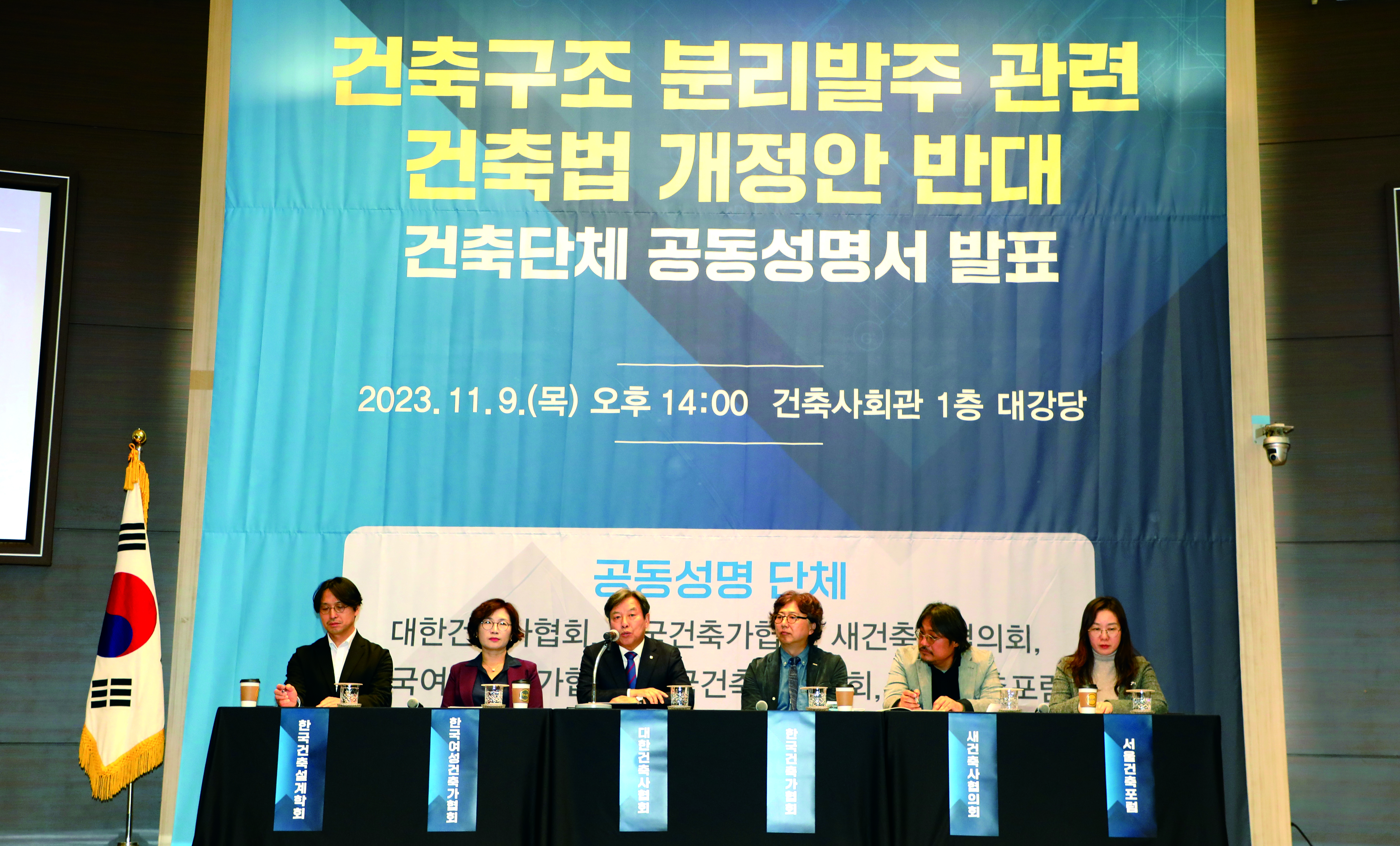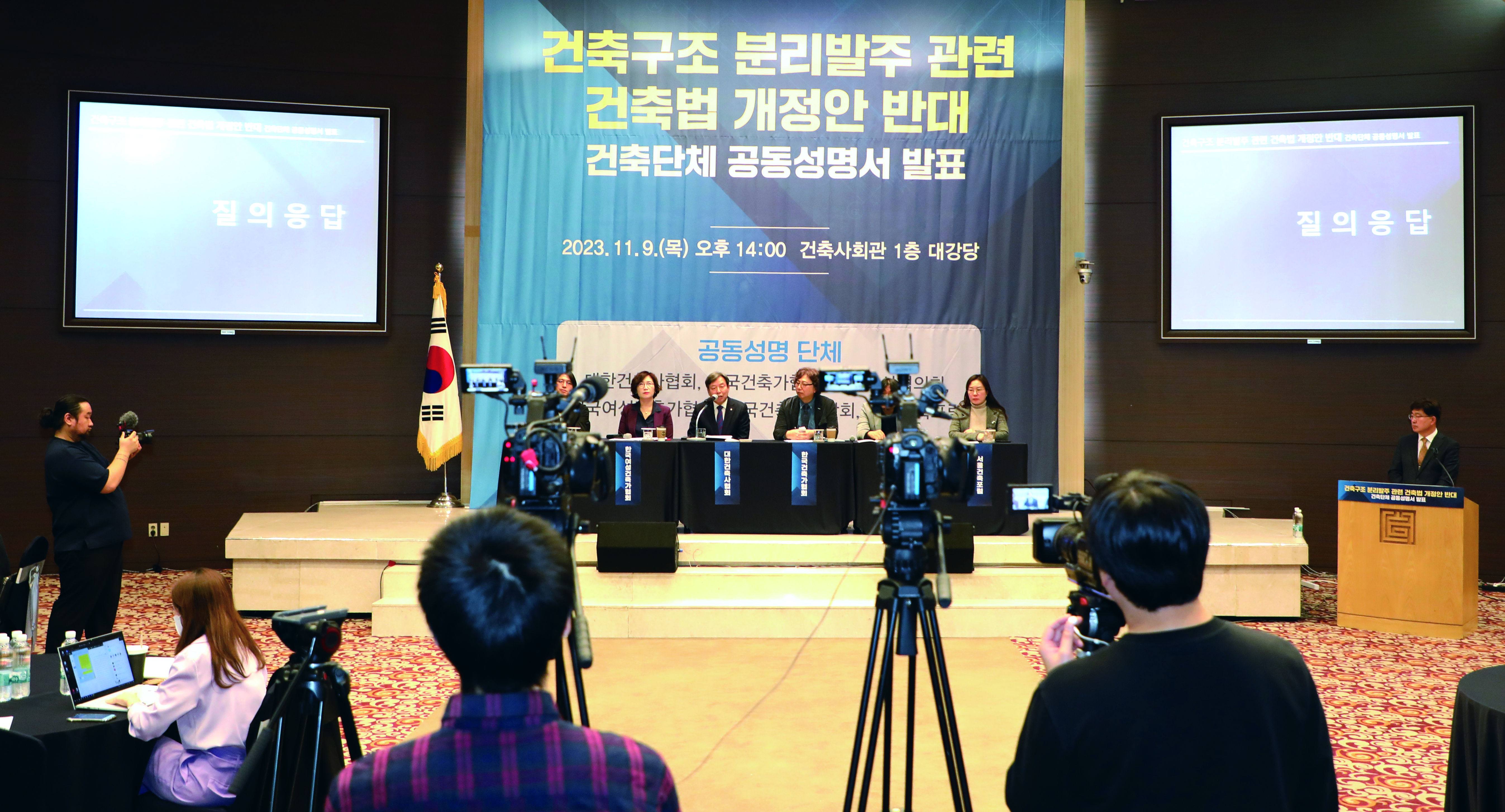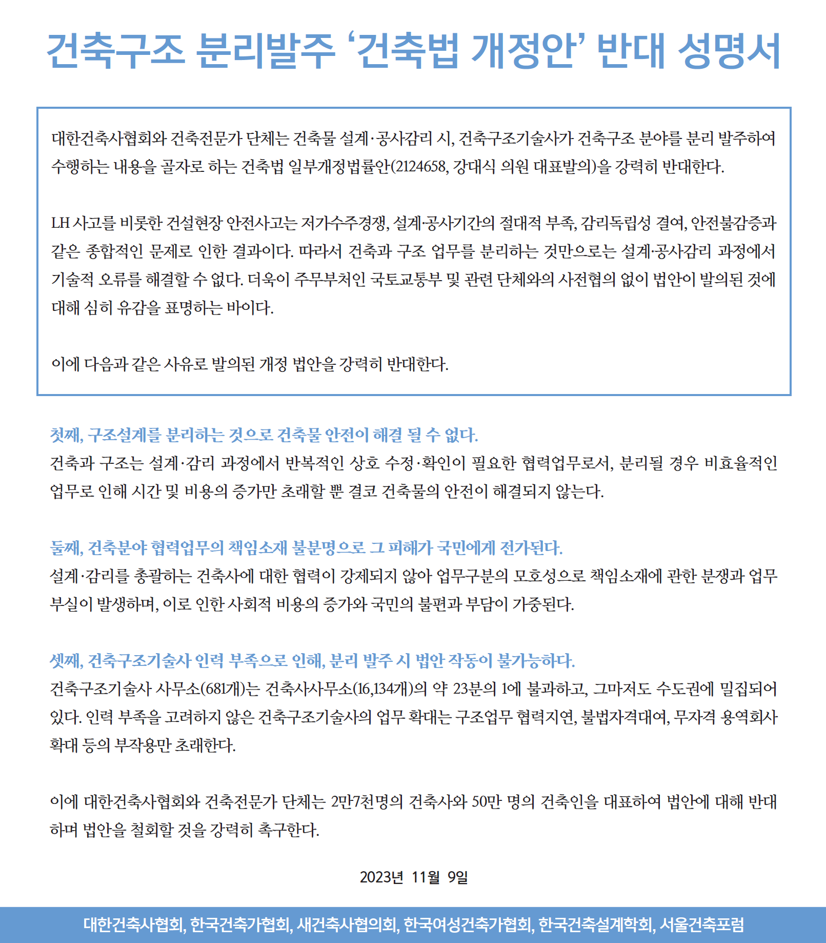 기자들과의 질의응답에서 대한건축사협회 석정훈 회장은 “지난 4월 발생한 인천 검단 아파트 지하주차장 붕괴사고 등 건축물 안전 관련 정부 조사와 결과에 대해 건축계 대표 단체로서 깊은 자성의 자세로 해결방안을 마련하기 위해 관계기관과 협의 중인 와중에 금번 법안이 발의됐다”며 “문제는 법안 발의로 건축물 안전이 마치 건축과 구조의 문제로 국한·왜곡되는 현실이며, 건축계 단체들은 이 부분을 바로잡고, 개정안의 부당성을 국민들에게 알리고자 한다”고 성명서 발표 취지를 밝혔다.