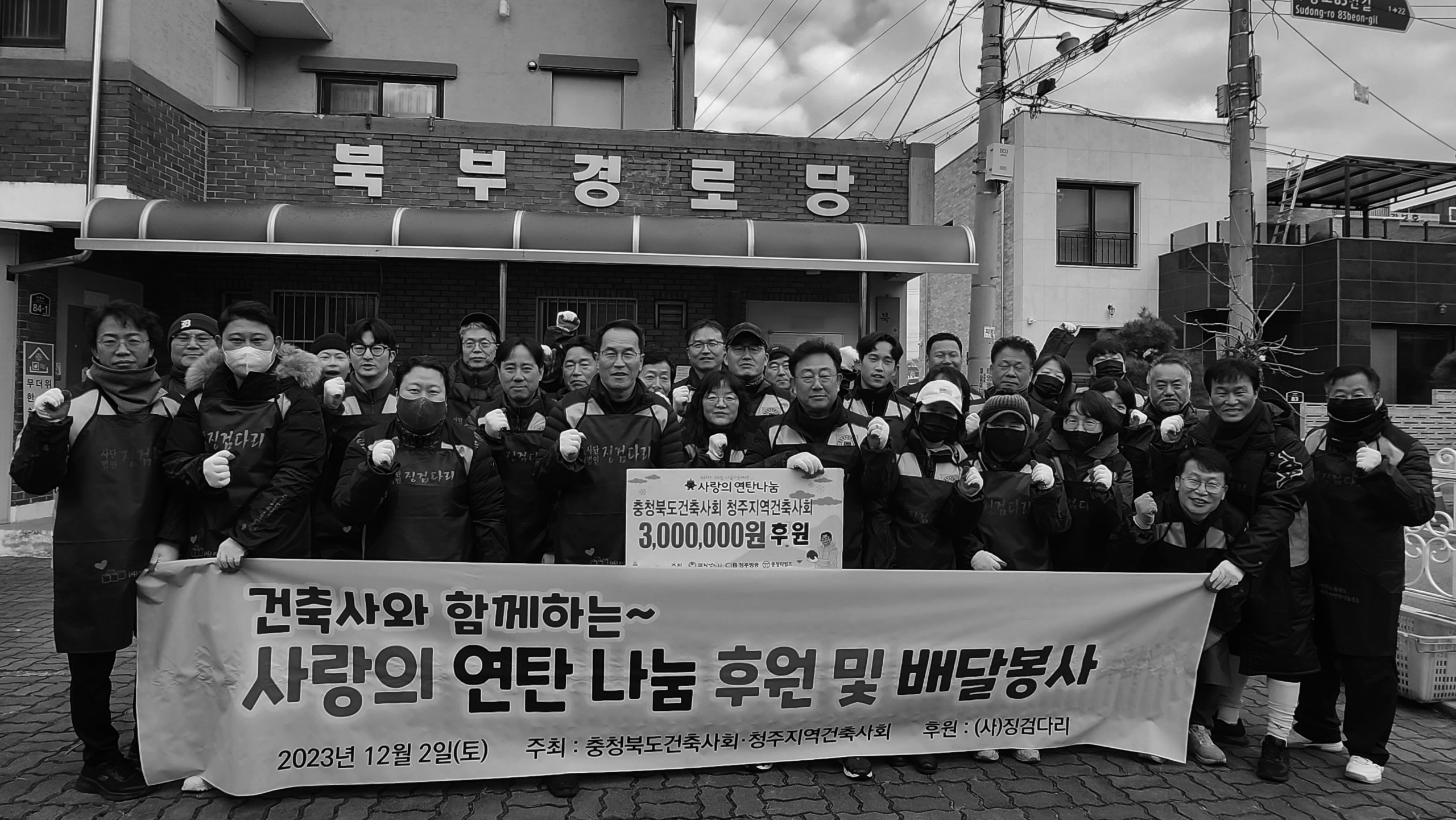 충청북도건축사회는 12월 2일 청주지역건축사회와 함께 ‘2023 연탄나눔 봉사활동’을 펼쳤다. 이날 청주시 수동 북부경로당에서 집결한 일행들은 연탄 250장을 4가구에 전달했으며, 또한 (사)징검다리에 연탄구입비 150만 원씩을 각각 기부했다.
