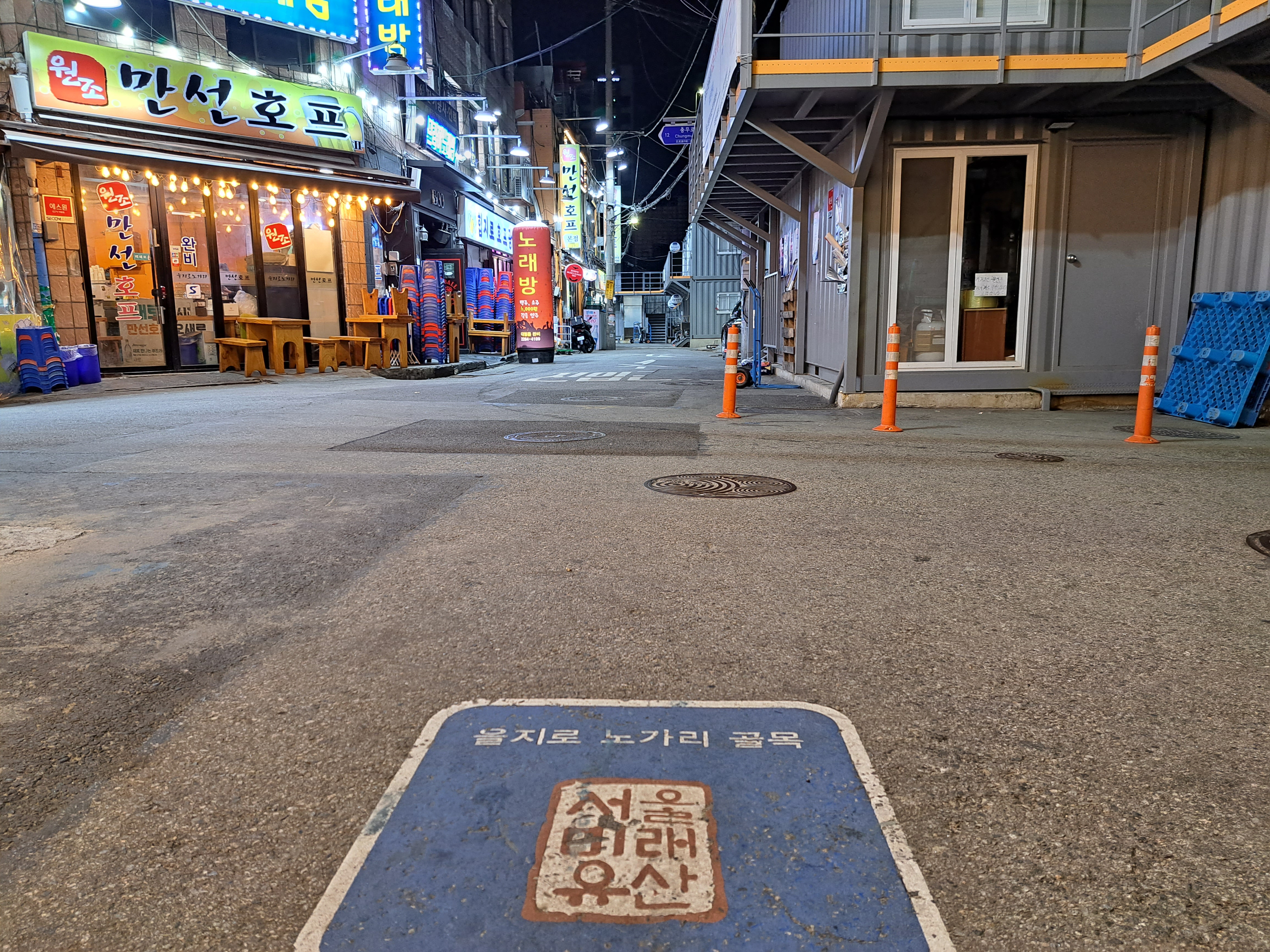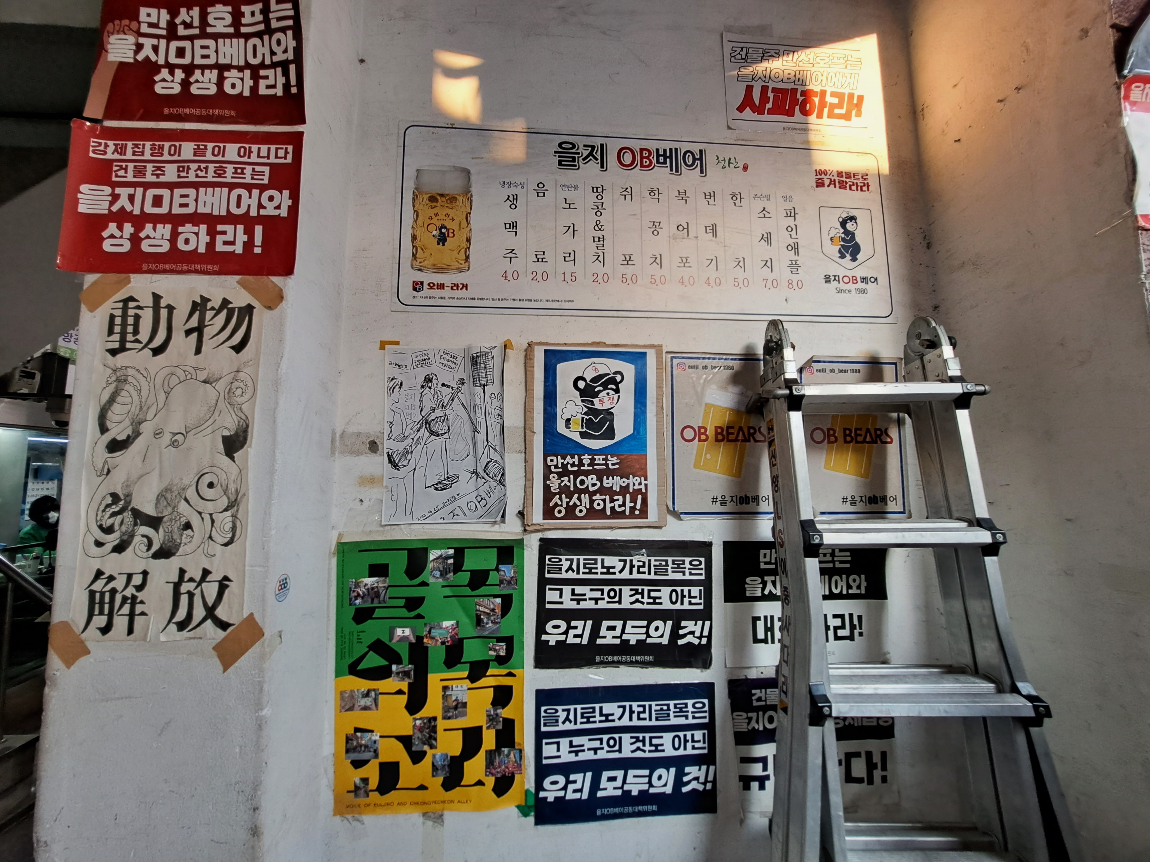 골목은 임차인이 일방적으로 쫓김을 당한 갈등 공간이기도 했다. 맨 처음 자리 잡아 골목을 키워낸 ‘을지OB베어’가 임차권 갈등으로 폐업하며 사라졌다. 을지OB베어가 사라진 자리는 다른 가게 차지가 되었으나, 이런 갈등이 얼마나 어리석었는지 그땐 몰랐다. 맞은 편에 자리했던 뮌헨호프 명성이 메아리로 들려온다. 골목을 오로지하다시피 한 만선호프 간판도 쓸쓸하기 그지없다.
