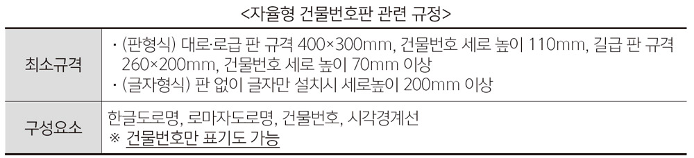 2012년 도로명주소 제도가 전면 시행되면서 건물번호를 표시한 표준형 건물번호판이 부착되고 있다. 행안부에 따르면 건물 명칭이나 상호가 자주 바뀌는데 반해 건물번호는 상대적으로 안정적이고 체계적이어서 생소한 지역을 여행하거나 방문할 때 건물번호판을 보고 길을 찾을 때 유용한 것으로 나타나고 있다. 다만 표준형 건물번호판은 규격과 모양, 재질 등이 획일적이어서 정보를 알려주기에는 유용하지만 건축물의 특성과 디자인과의 조화가 아쉽다는 지적이다. 이에 행 정안전부는 2009년 8월 ‘도로명주소 안내시설 규칙’을 제정하면서 자율형 건물번호판 제도를 도입했다. 건축주가 건물 의 특성·디자인과 어울리는 건물번호판을 제작 설치할 수 있도록 하기 위함이다. 하지만 국민들의 실제 사용률은 신축 건물의 1% 수준에 머물러 있어 유명무실한 상황이다. 현행법상 자율형 건물번호판을 제작·설치하려면 설치 신청서에 크기, 모양, 재질, 부착위치 등을 표기한 도면을 첨부해 지자체에 신청해야 한다. 단, 설계도서에 건물번호판 등의 크기, 모양, 재질, 부착 위치 등을 반영해 건축물 허가·신고를 할 땐 이를 생략할 수 있다.