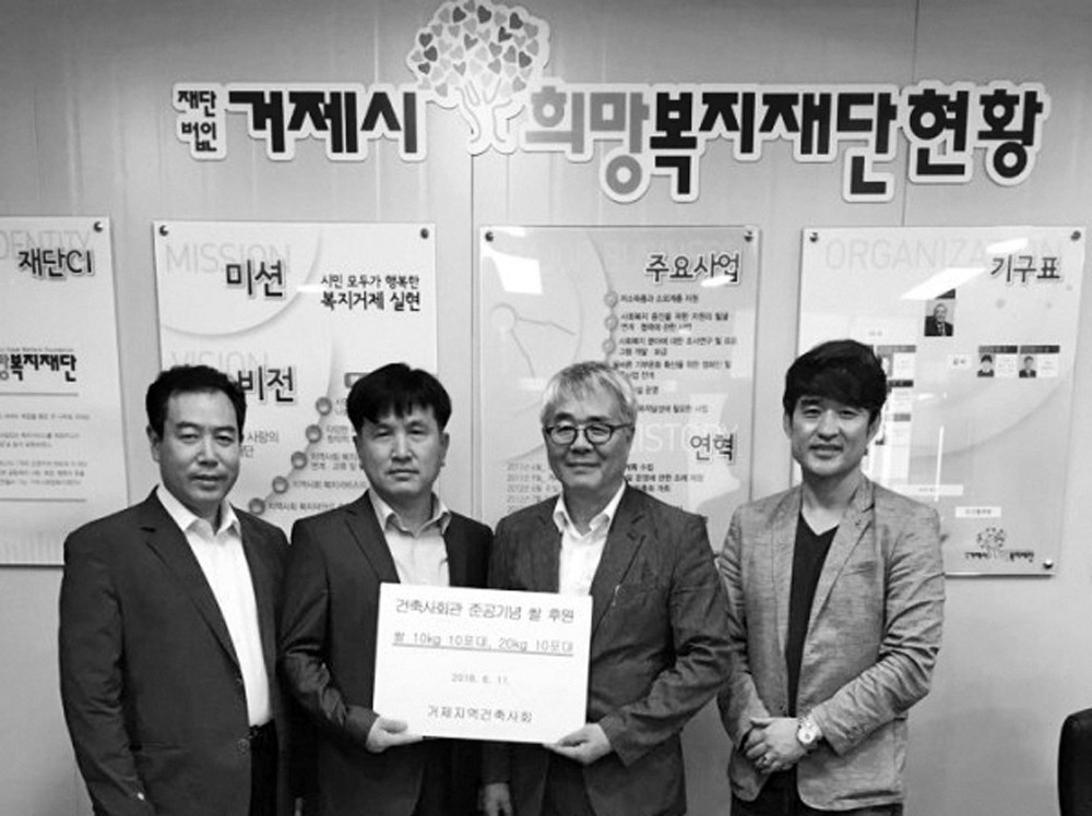 거제지역건축사회가 6월 11일 재단법인 거제시희망복지재단을 방문하여 쌀 20포를 기탁했다. 거제지역건축사회 김성 민 회장은 “복지사각지대에 있는 이웃들에게 사랑과 나눔을 실천하기 위해 쌀을 기부하게 됐다.”고 전했다.