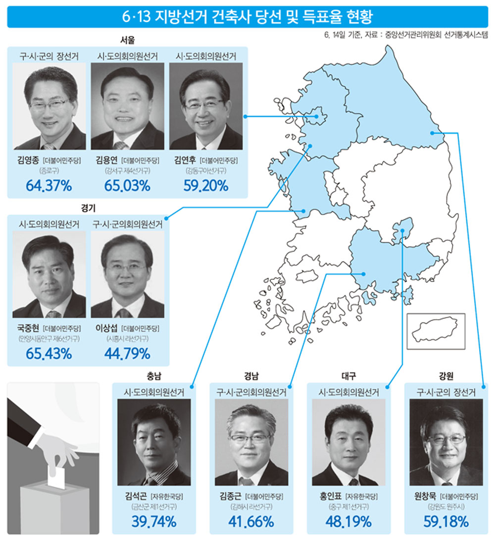 시·도의회 의원에 국중현 건축사(안양시 제6선거구)가 65.43%로 김대영 후보(34.56%)를 두 배 차이로 따돌리고 당선 됐다. 구·시·군의회 의원에는 이상섭 건축사(시흥시 라선거구)가 22,070표(44.79%)를 얻어 8,812표를 얻은 김창수 후 보(17.88%)를 누르고 당선됐다.