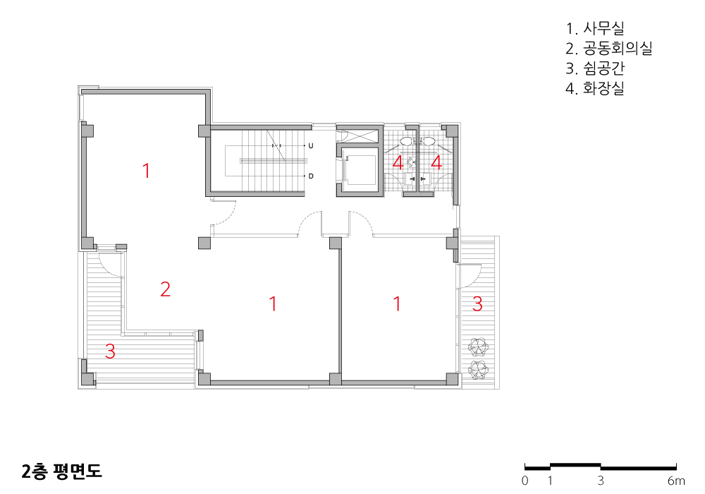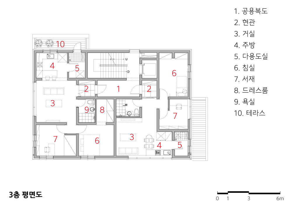 상층부는 주택이라는 특성을 고려했다. 내밀한 내부 공간의 특성을 반영한 창, 각 층마다 여러 방향으로 뻗어있는 테라스, 그리고 쉼 공간을 적절히 배치하여 부지에 주어진 시각적 배경을 온전히 누린다. 특히 일조권 사선제한으로 인한 4층 주택의 내부 이격은 새로운 공간 활용의 기회가 되었다. 이격으로 인한 자연스러운 틈새는 사방을 돌아볼 수 있는 동선이 되고, 내·외부 연결성을 높인다.