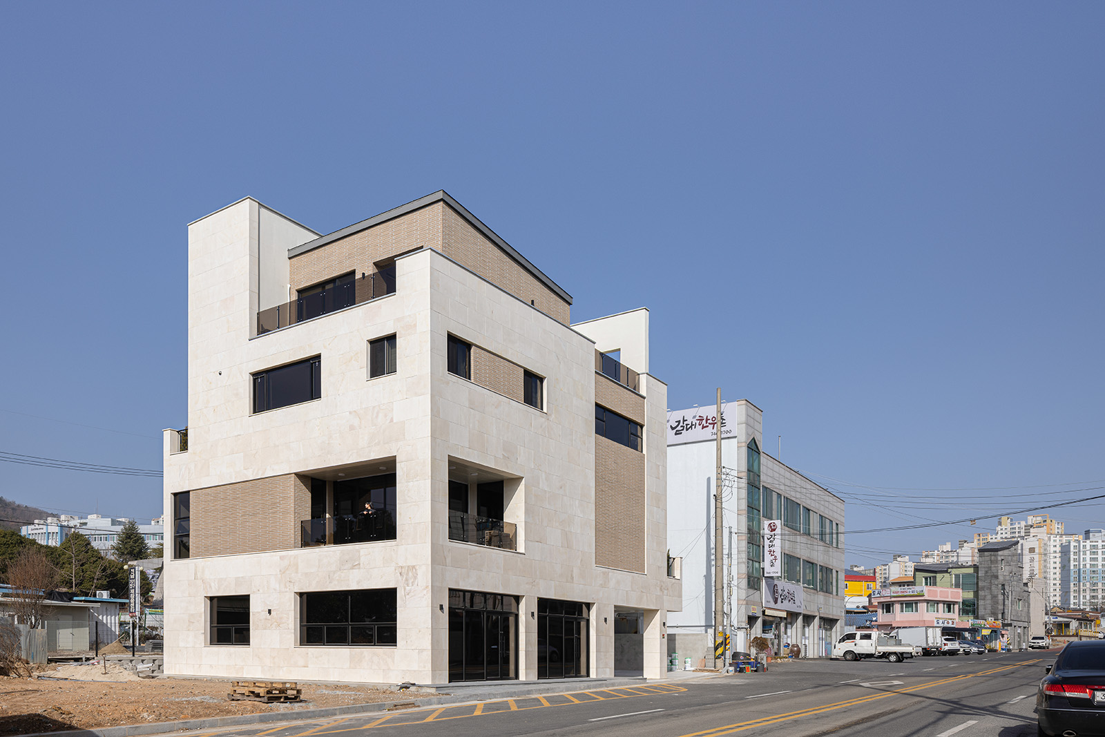 The house functions as a typical commercial building, and it was built as three siblings, who were scattered due to studies and works, decided to live together. The third and fourth floors are designed as a multi-household house for three siblings. The first and second floors have neighborhood living facilities with the maximum area for economic stability and functionality in consideration of profitability.