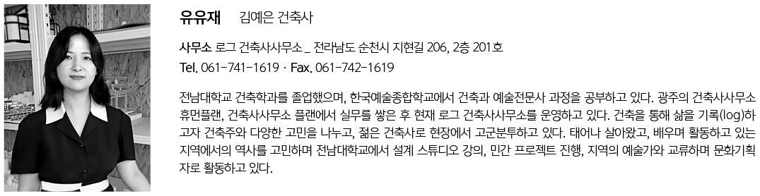 | 유유재 설계자 | 김예은 _ 로그 건축사사무소 건축주 | 로그 감리자 | 건축사사무소아키라인(주) 시공사 | 만보종합건설(주) 대지위치 | 전라남도 순천시 지현길 206 주요용도 | 단독주택(다가구주택), 근린생활시설 대지면적 | 321.00㎡ 건축면적 | 184.92㎡ 연면적 | 592.58㎡ 건폐율 | 57.61% 용적률 | 184.60% 규모 | 4F 구조 | 철근콘크리트구조 외부마감재 | 라임스톤, 모노롱타일, 스타코플렉스 내부마감재 | 친환경페인트, 벽지, 도기질타일 설계기간 | 2020. 12 - 2021. 08 공사기간 | 2022. 04 - 2022. 12 사진 | 김성희 _ 사진짓기 구조분야 | 주식회사 아이원구조엔지니어링 기계설비분야 | 미오엔지니어링 전기분야 | (주)한울이엔지 소방분야 | (주)한울이엔지 |