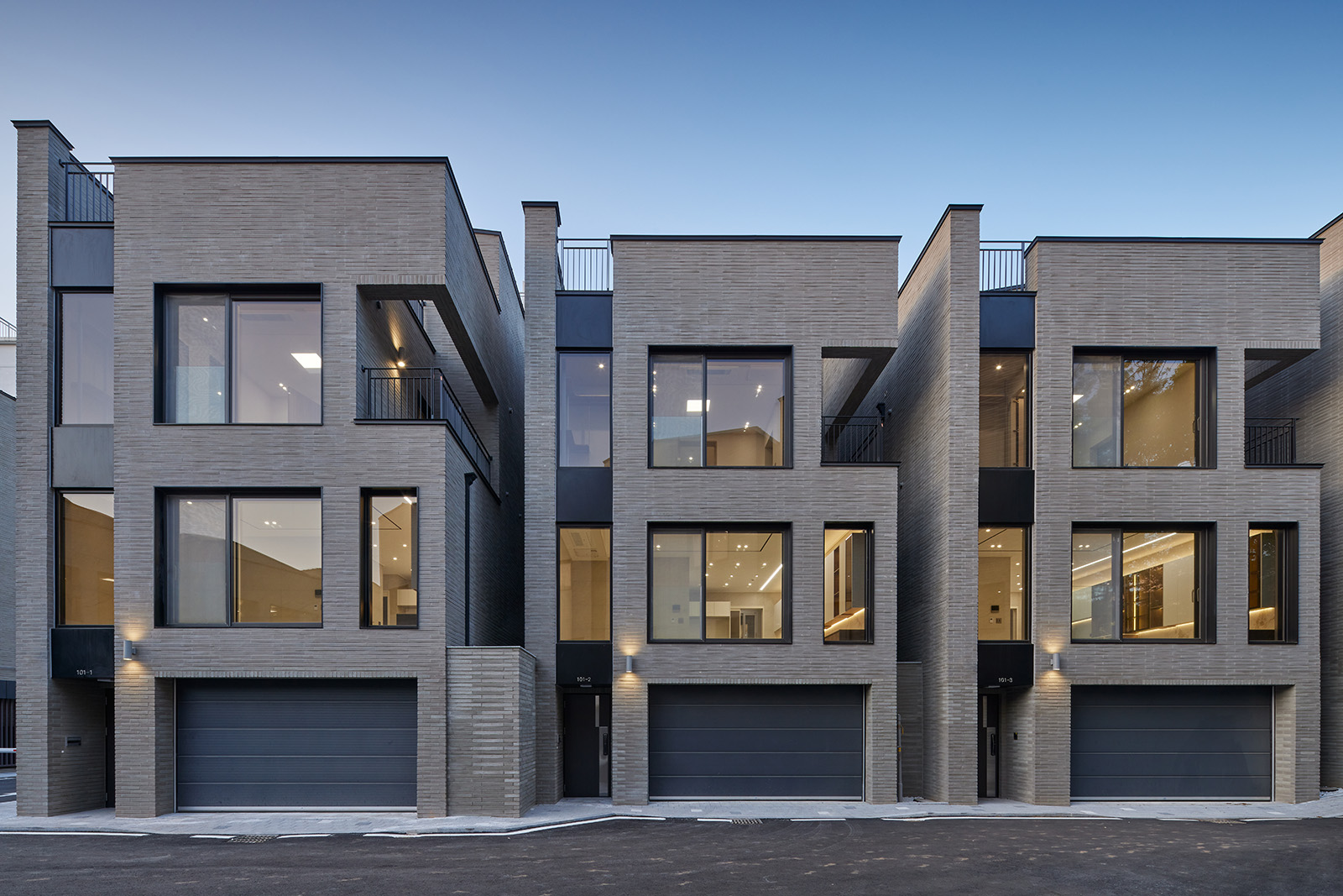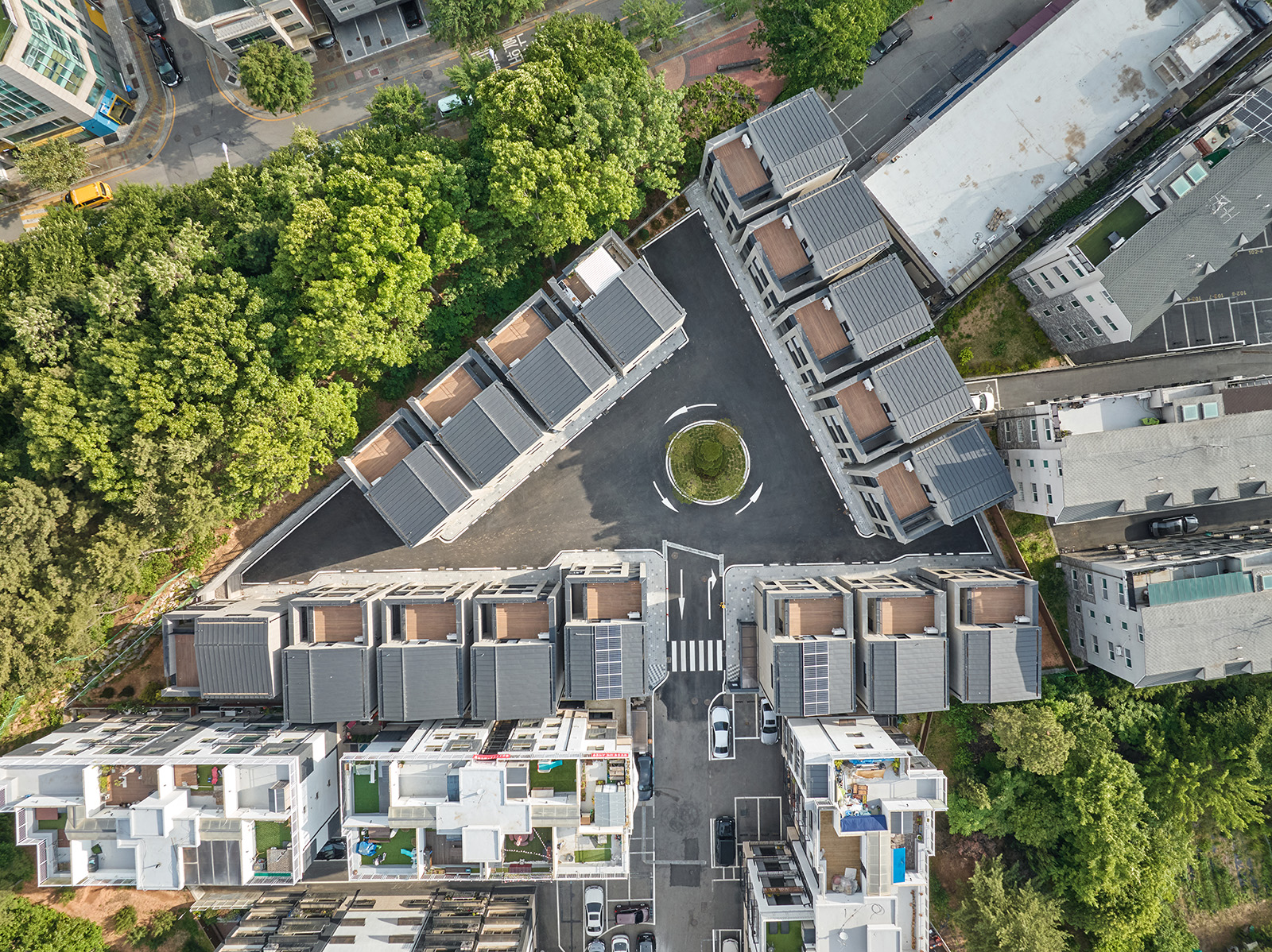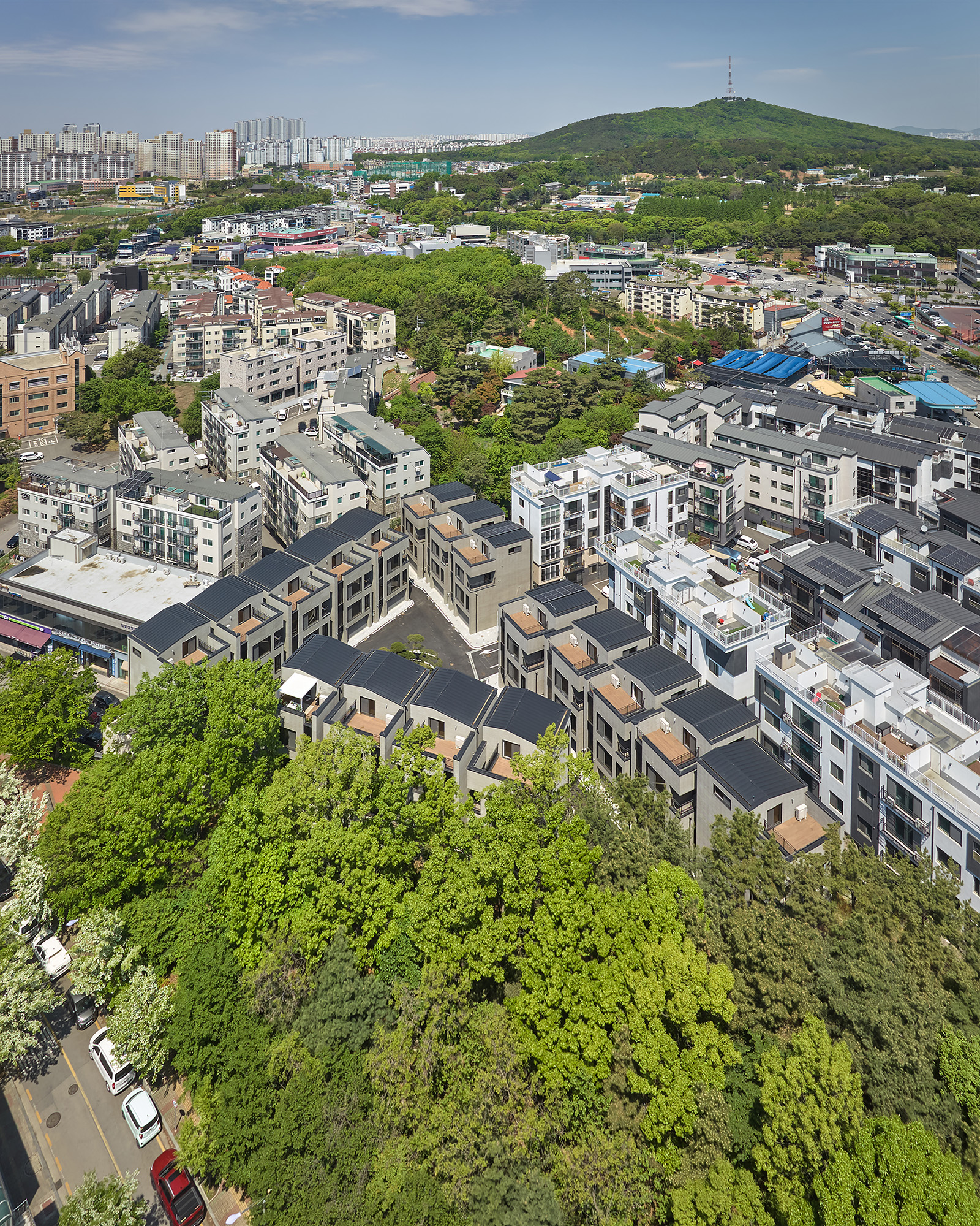 각각의 건물이 갖고 있는 정형화된 건축의 단조로움은 대지의 효과적인 사용과 더불어 시각적 피로함을 덜어내면서도 입면 재료 분할과 볼륨감 부여로 각도에 따라 형태적인 개성을 느낄 수 있도록 계획했다.
