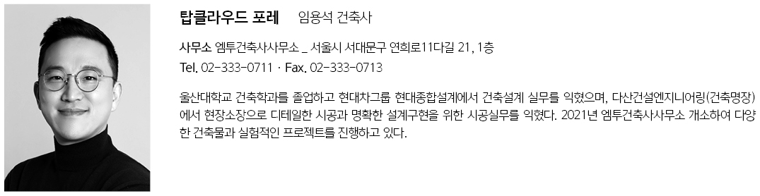 | 탑클라우드 포레 설계자 | 임용석 _ 엠투건축사사무소 건축주 | 김종권, 김명랑 감리자 | 정안나 _ 앤건축사사무소 시공사 | 주식회사 명성종합건설 설계팀 | 김소연 설계의도 구현 | 엠투건축사사무소 대지위치 | 경기도 고양시 숲속마을2로 63, 65 주요용도 | 단독주택_타운하우스 대지면적 | 2,669.00㎡ 건축면적 | 1,060.39㎡ 연면적 | 2,381.26㎡ 건폐율 | 39.73% 용적률 | 89.22% 규모 | B1F - 3F 구조 | 철근콘크리트구조 외부마감재 | 롱브릭파벽돌, 아연도강판(분체도장) 내부마감재 | 폴리싱타일, 벽지 설계기간 | 2022. 07 - 2023. 02 공사기간 | 2023. 02 - 2023. 07 사진 | 노경 구조분야 | 라임구조 기계설비분야 | 아이에코 ENG 전기분야 | 아이에코 ENG 소방분야 | 아이에코 ENG |