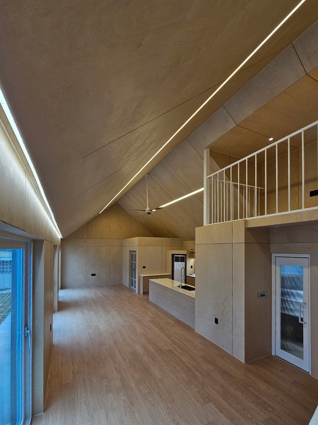 전체적 건물의 배치는 본동과 부속 동이 서로 직각으로 배치되고, 본동은 세컨드하우스의 사용성을 고려해 남향 배치와 큰 개구부를 두어 외부와의 시각적, 시간적 소통이 잘 이루어질 수 있게 디자인했다. 내부는 외부에서 느낄 수 없는 자작나무의 따뜻함과 은은함을 만들어 낸다.