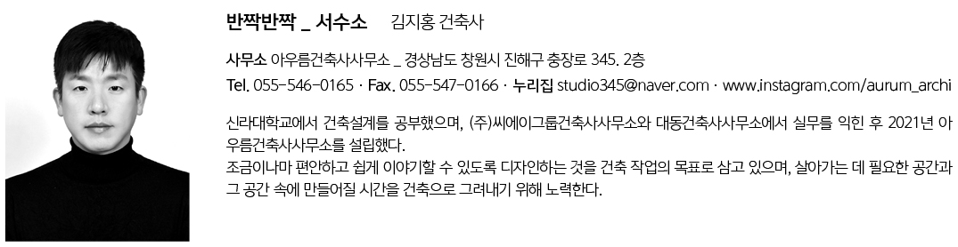 단순한 건축물의 볼륨은 기존 건축이 가지고 있던 박공지붕의 간결함을 더욱 빛나게 만들었다. 외부는 말 그대로 언제나 빛날 수 있는 재료인 골강판을 사용하기로 했다. 골강판의 경우 호불호가 나누어지다 보니, 제안하는 것도 결정하는 것도 고민이 있었지만, 기꺼이 도전해 보았다.