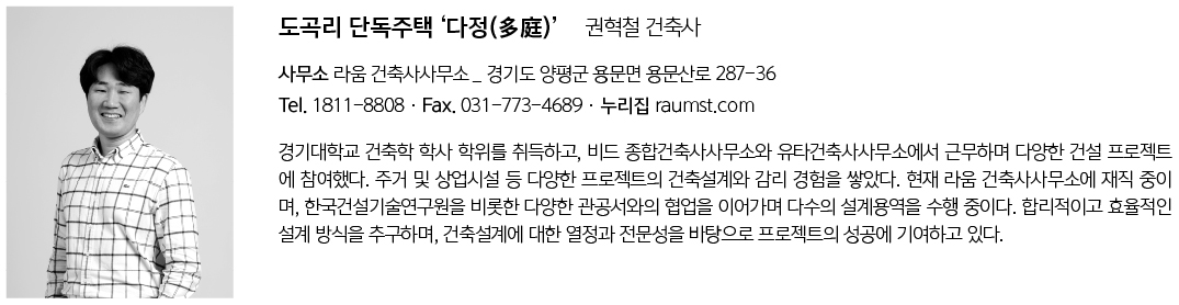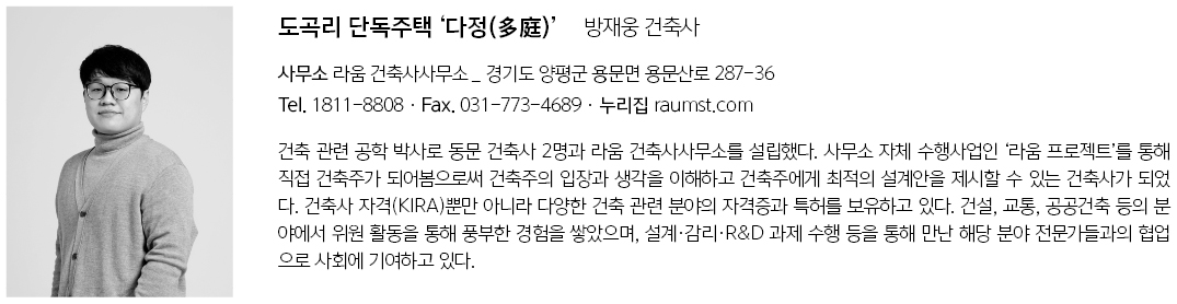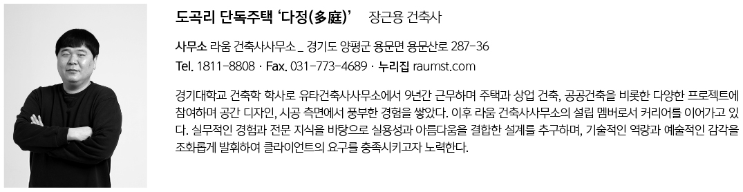 | 도곡리 단독주택 ‘다정(多庭)’ 설계자 | 방재웅 · 장근용 · 권혁철 _ 라움 건축사사무소 건축주 | 김영주 감리자 | 라움 건축사사무소 시공사 | 바움하우스 설계의도 구현 | 라움 건축사사무소 대지위치 | 경기도 양평군 양평읍 도곡리 주요용도 | 단독주택, 사무실 대지면적 | 874.00㎡ 건축면적 | 174.03㎡ 연면적 | 228.06㎡ 건폐율 | 19.91% 용적률 | 26.09% 규모 | 2F 구조 | 철근콘크리트구조 외부마감재 | 고벽돌타일, 칼라강판 내부마감재 | 강마루마감, 실크벽지 설계기간 | 2020. 11 – 2021. 05 공사기간 | 2021. 06 – 2022. 04 사진 | 이한울 구조분야 | (주)이든구조컨설턴트 기계설비분야 | (주)코담기술단 전기분야 | (주)코담기술단 소방분야 | (주)코담기술단 |