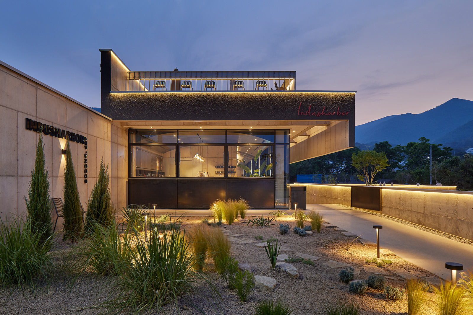Cafe Indusharbor Architect | Koo, Joongjung _ KOOJOONGJUNG ARCHITECTS Client | Kim, Jihyun Supervisor | KOOJOONGJUNG ARCHITECTS Construction | SAMWON CONSTRUCTION Project team | Park, Hyuntae Design intention realization | KOOJOONGJUNG ARCHITECTS Location | 467, Sodong-ri, Irun-myeon, Geoje-si, Gyeongsangnam-do, Korea Program | Neighborhood living facilities(Cafeteria) Site area | 1,028.00㎡ Building area | 196.40㎡ Gross floor area | 196.40㎡ Building to land ratio | 19.11% Floor area ratio | 19.11% Building scope | 1F Structure | RC Exterior finishing | STO EIFS, Exposed concrete Interior finishing | Plywood with water base stain, Exposed concrete, Polished concrete Design period | May 2021 - Nov. 2021 Construction period | Nov. 2021 - May 2022 Photograph | Roh, Kyung Structural engineer | HANGIL STRUCTURAL ENGINEERING Mechanical engineer | MK CHEONGHYO Electrical engineer | MK CHEONGHYO Landscape engineer | SEOUL GARDENING CLUB |