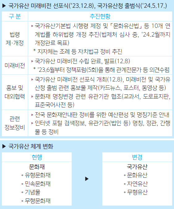 작년 5월 국가유산기본법이 제정된 이후, 국가유산 체제로의 전환을 위해 ▲법령 제·개정 ▲미래비전 수립 ▲국가유산 관련 정보정비 ▲홍보 및 대외협력의 틀에서 체제 전환을 추진하고 있습니다.
