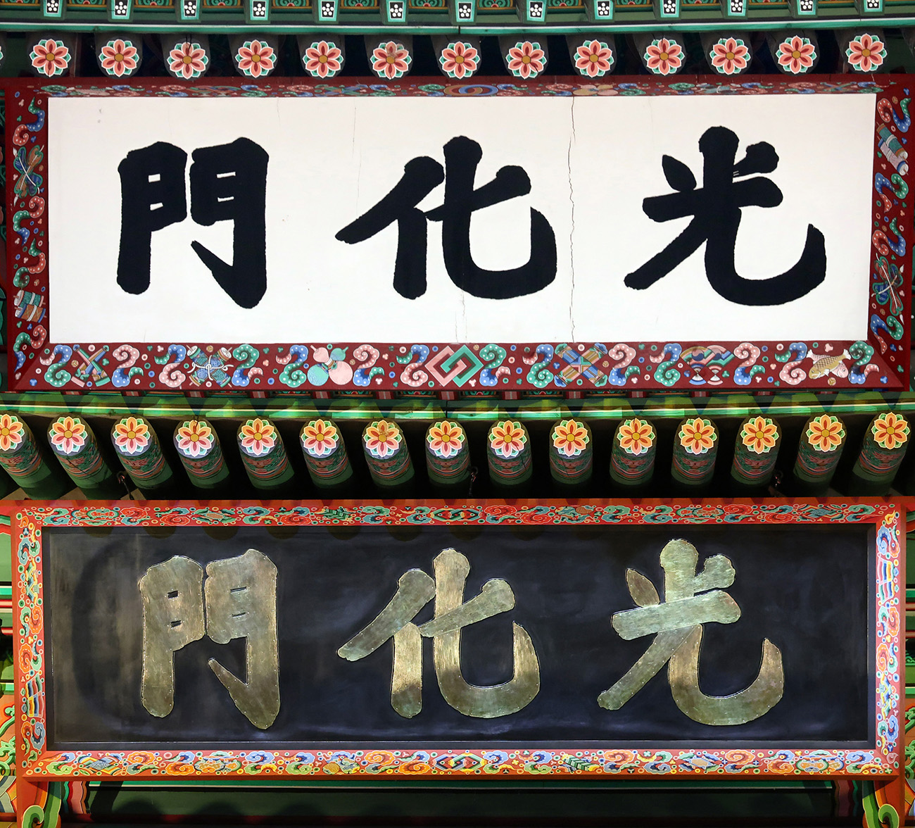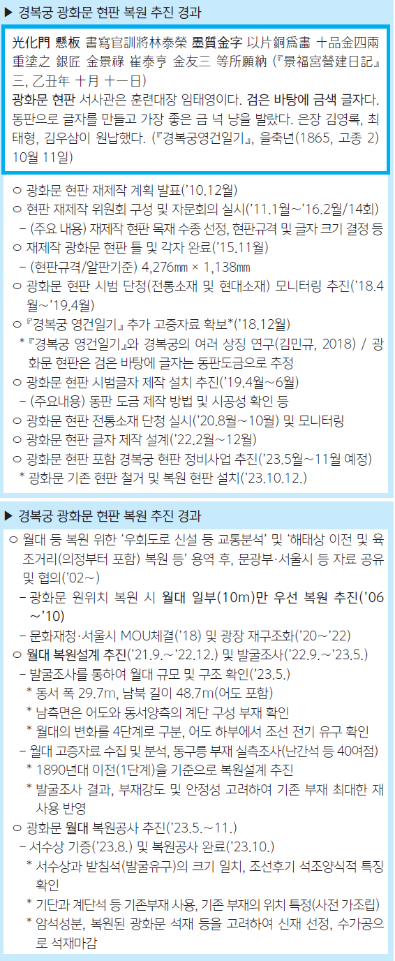 2010년 광화문 현판 재제작 계획을 발표한 이래, ‘경복궁 영건일기’에서 광화문 현판이 흑질금자(검정 바탕에 금색 글자)라는 기록이 확인되면서 옛 모습 복원이 추진됐습니다. 2018년부터 5년간 전문가 고증을 거쳐 현판이 제작됐고, 작년 10월 12일 기존 현판 철거 후 복원 현판이 설치됐습니다.