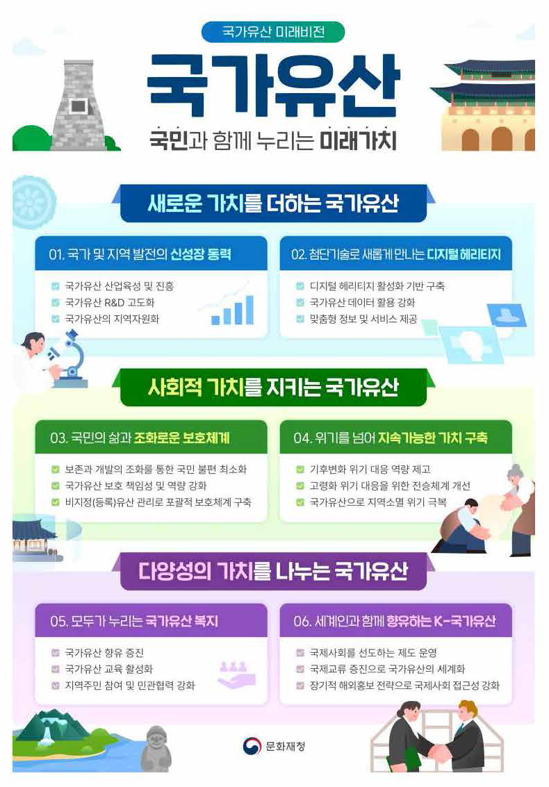 첫째, 국보·보물 등 유형 문화유산의 보존에 중점을 둔 현 체계에서 벗어나, 문화유산-자연유산-무형유산 모두를 통합적으로 보존하는 체계로 전환할 것입니다.