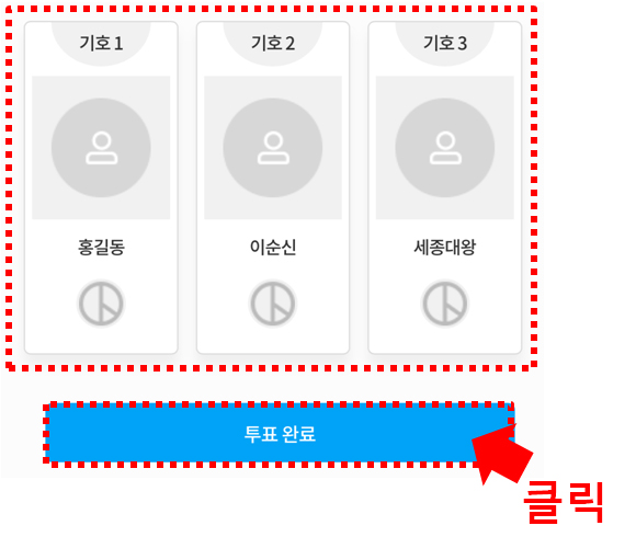 선택하는 후보자 “투표도장”을 클릭하고 “투표완료” 버튼을 클릭하면 [선택 후보자 확인]으로 화면으로 이동됩니다.
