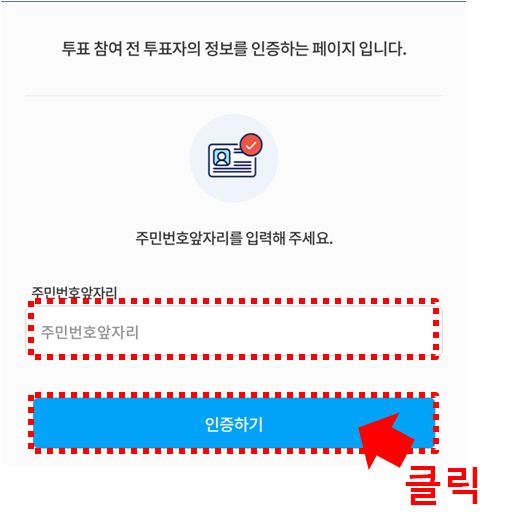 ‘주민번호 앞 6자리’ 입력을 한 후, ‘인증하기’를 클릭하면 [투표하기]로 화면이 이동됩니다.