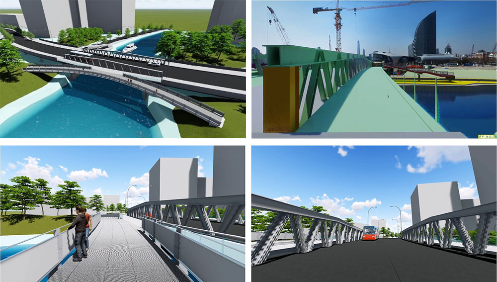 교량 건설에 사용되는 가상 시뮬레이션은 시공업자의 이해를 돕고 현장에서의 작업지시가 수월하게 돕는다. BIM데이터 설계에 관한 내용을 가상의 시뮬레이션(AR, VR)으로 사용 해서 건축주뿐만 아니라, 각 분야 전문 기술자들 간의 협업을 이끌어 내기도 한다.