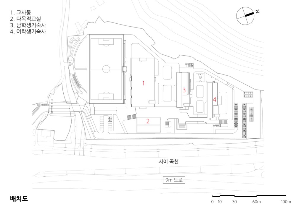 계곡에서 내려오는 산곡풍을 고려하여 열린배치로 계획했다. 산에서 내려오는 녹지의 흐름이 학교의 건물로 인해 끊이지 않도록 데크를 이용하여 학생들이 자유롭게 놀 수 있는 외부 공간을 조성했다. 기숙사와 교사동은 이동을 최소화하여 편안한 동선배치에 중점을 뒀다.