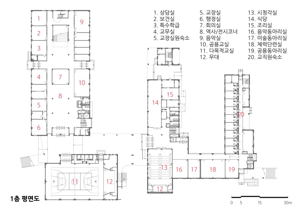 The inside of the school was planned mainly for students. The library, which is responsible for the students' creativity and personality education, is placed at the center of the school to enhance accessibility. The central space with high density is designed to be used as a gathering place for students by arranging wide stairs considering lighting and ventilation. Students sit on the stairs, chat with their friends, and relax. The stairs will be the community base of the school and the space where the various use and communication among students will be most active.