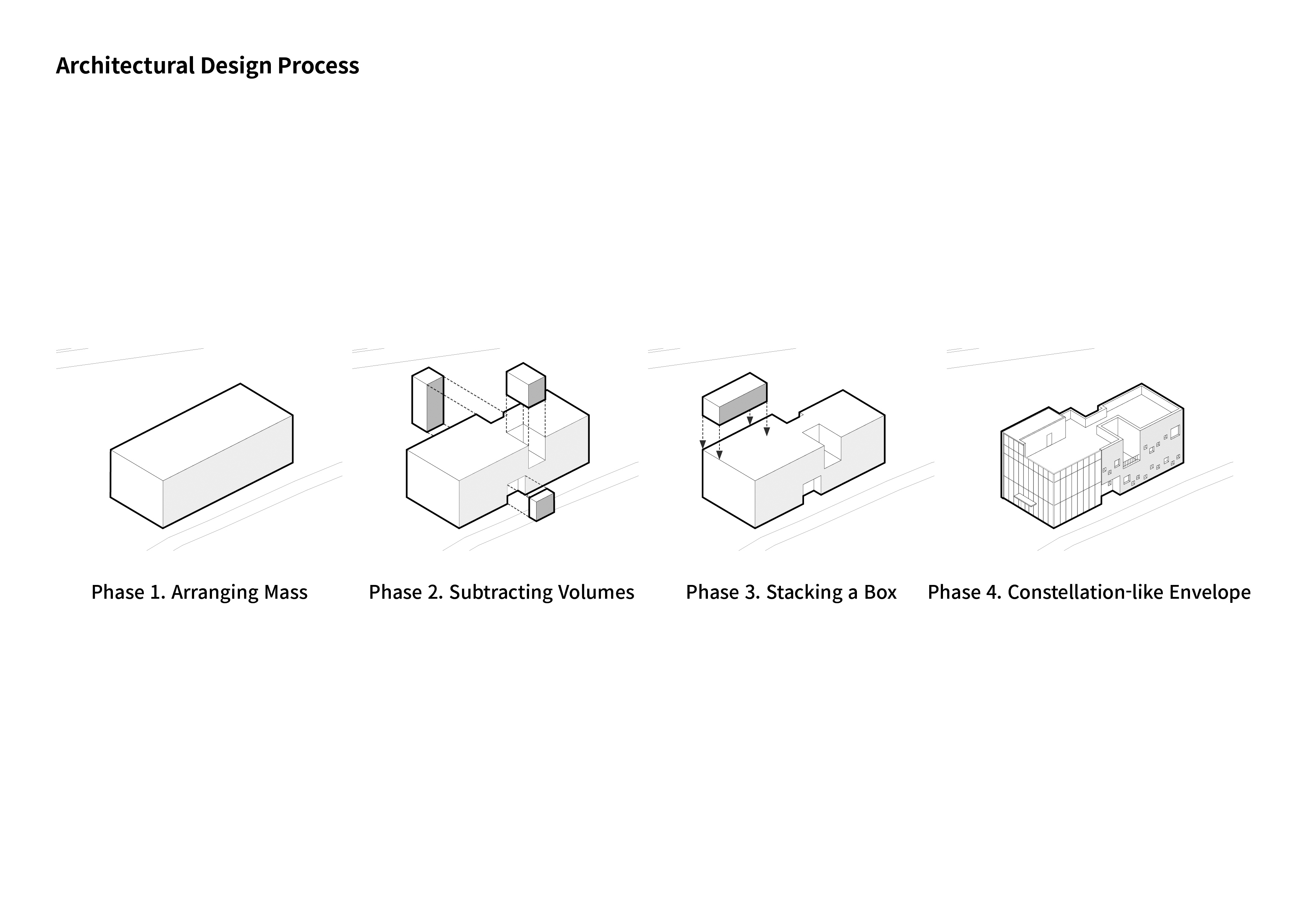 AR/VR Learning Center at Sangnok Youth Center is the first independent AR/VR-dedicated building in South Korea. Existing Youth Center is composed of very complicated design elements, combined many colors with diverse materials such as zinc, aluminium and glass, by which buildings are not harmonized with each other and it’s such an unplaced complex. So, we focus on designing very minimal architecture that would stand out in the complicated complex, using well-arranged design language, which is the opposite way of existing youth center. In order to design specific AR/VR spaces in the existing Sangnok Youth Center complex, we propose to connect the architecture to the nature through subtraction of several spaces, as void volumes. The site is enclosed by natural elements such as mountain and there is a long promenade, on which many people walk and work out. We though that it’s very important to make a spatial relationship between the architecture and the nature. Along with this idea, we proceed to study several series of subtracting architectural volumes toward the mountain, which is on the south, as the spaces are able to be outdoor veranda or terrace or small communal space on the 1st and 2nd floors. As a result, throughour architectural concept for connecting the space toward the nature, the architecture surely has the unique outdoor space of veranda as subtracted void volumes, communicating with people and also the nature.
