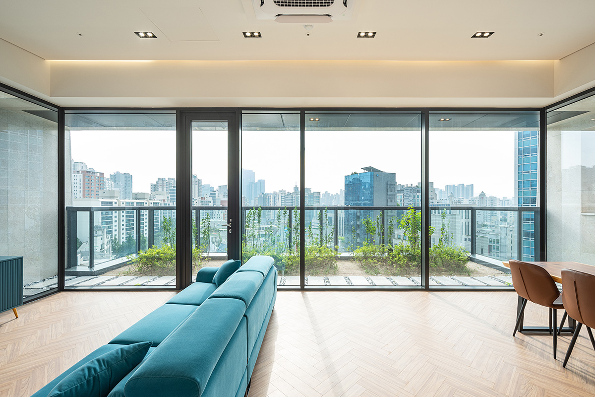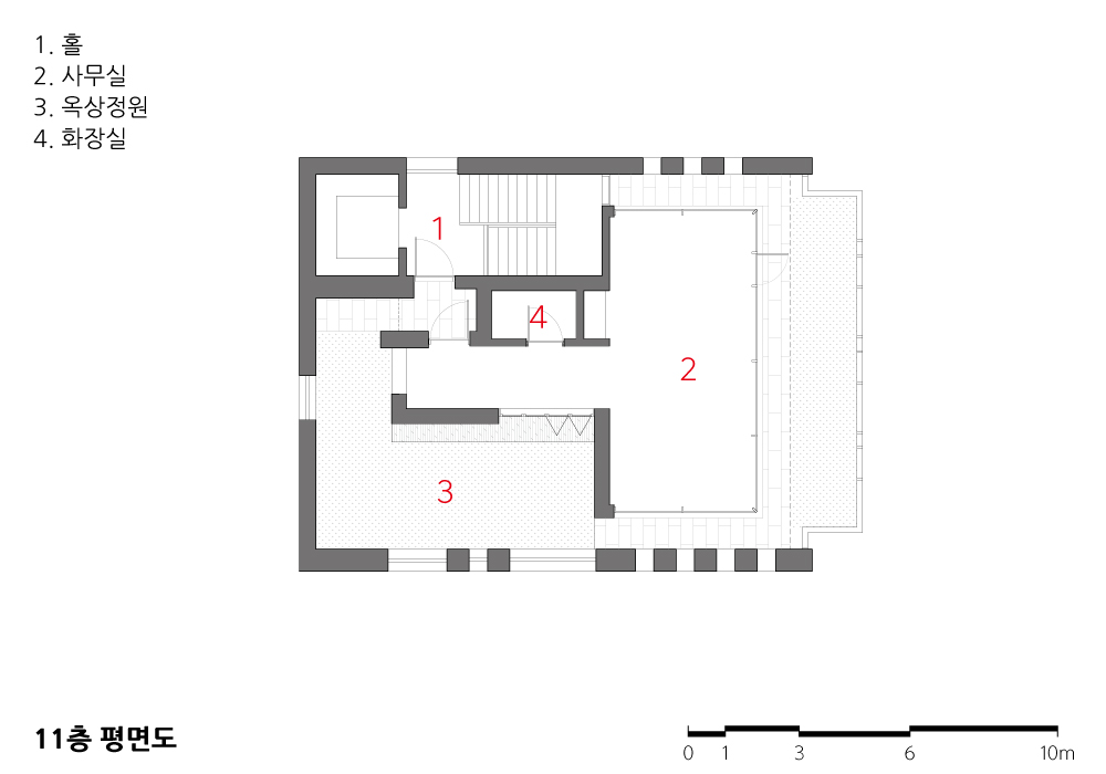 2층의 녹색 공간은 옥상으로도 이어진다. 최상층에 만들어진 이곳은 건축주의 개인 업무공간으로 사용될 예정이라, 가능한 별도의 대지에 세워진 독립된 건물처럼 보이도록 했다. 11층 엘리베이터에서 내리면 계단실 왼쪽 끝의 세로로 긴 창을 통해 매스 틈 사이로 바깥 풍경이 힐끗 보인다. 오른편으로 돌아 문을 열면 외기에 면한 작은 바깥 공간으로 나가게 된다. 분리된 별도의 공간으로 들어가는 느낌이 되도록 했다. 다시 앞의 현관문을 열면 왼편으로 돌아서 주 공간으로 연결되는 복도가 보인다. 복도는 외부 정원과 연결되도록 긴 폴딩도어가 큰 창문 겸 문의 역할을 한다. 복도 밖에는 앉아서 작은 정원을 감상할 수 있도록 툇마루가 붙어있다. 복도를 지나 주 공간으로 들어서면 전면이 개방된 창호를 통해 도시의 풍경이 한눈에 들어온다. 그 앞에는 발코니를 겸하는 작은 정원이 만들어져 있다. 건물이 땅을 채워 없어진 외부공간을 옥상의 정원으로 되살리자는 의도로 ‘ㄷ’자 형태의 정원이 최상층을 둘러싸고 있다.
