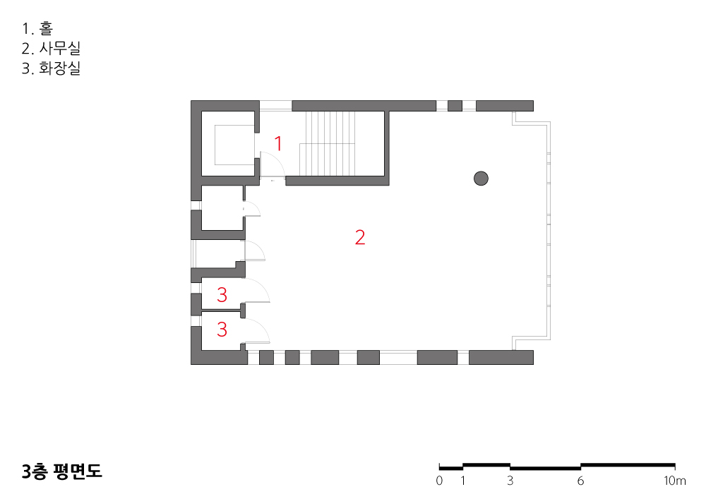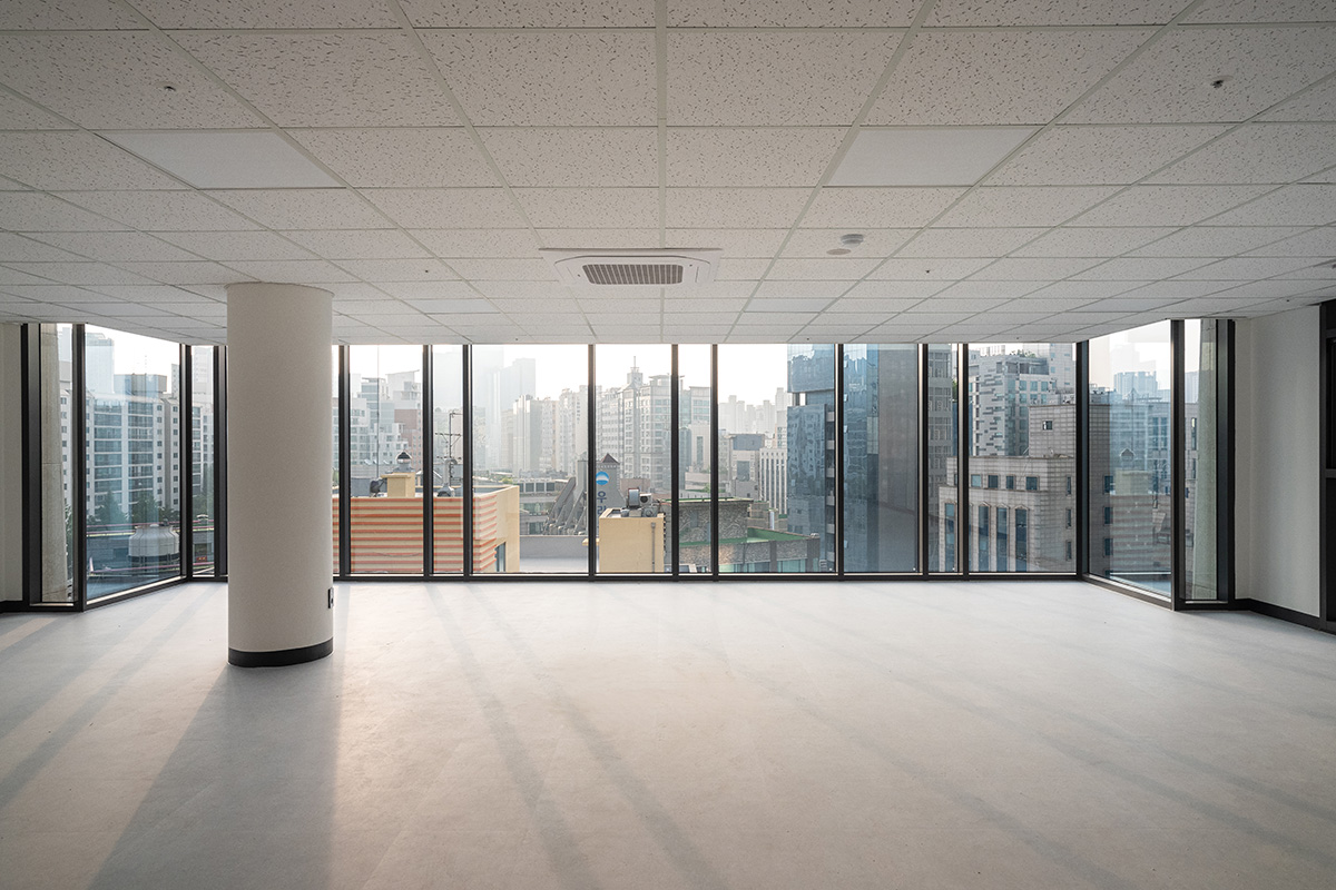 기준층 대부분의 용도는 사무공간이다. 기둥에 의해 공간의 사용이 방해받지 않도록 기둥 없는 구조로 만들고자 했다. 그래서 외벽 자체를 내력벽으로 만들어 전면 쪽 한 개의 원기둥을 제외하고는 기둥을 만들지 않았다. 건물 대부분은 코어와 외벽으로 지탱된다. 밖에서 보았을 때 남과 북측에 강성을 가진 외벽을 표현하기 위해 세로로 긴 창을 불규칙적으로 배치했다. 벽이 너무 무겁게 보이지 않도록 남측 중앙부는 사선으로 틈을 만들고, 골목으로 접근할 때 색다른 모습이 되도록 했다. 양단의 외벽 사이에는 가벼운 유리 매스가 공중에 떠있는 듯 끼워져 있다. 1층 남측 끝에는 외부 계단이 지하층의 작은 선큰 마당과 연결되어 지하에 들어설 상업공간에도 빛과 공기가 통하도록 했다.