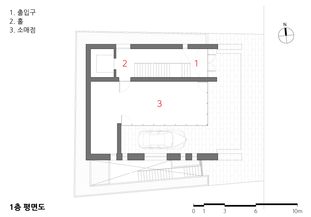 대지가 면한 골목은 유동인구가 적지 않은 곳이다. 거리는 즐거운 풍경도, 눈길이 가는 곳도 별로 없는 평범한 모습이다. 이곳에 작은 변화를 만들어내고 싶었다. 1층은 주차공간으로 할애하고 작은 상가를 만들어야 해서 마땅한 공간이 없다. 그래서 2층 발코니를 가능한 길게 내밀어 나무를 심기로 한다. 길을 오가는 사람들에게 작지만 녹색의 풍경을 선사할 수 있지 않을까? 2층에 커피숍이나 레스토랑이 들어온다면 손님에게도 좋은 인상을 주는 공간이 될 것이다.