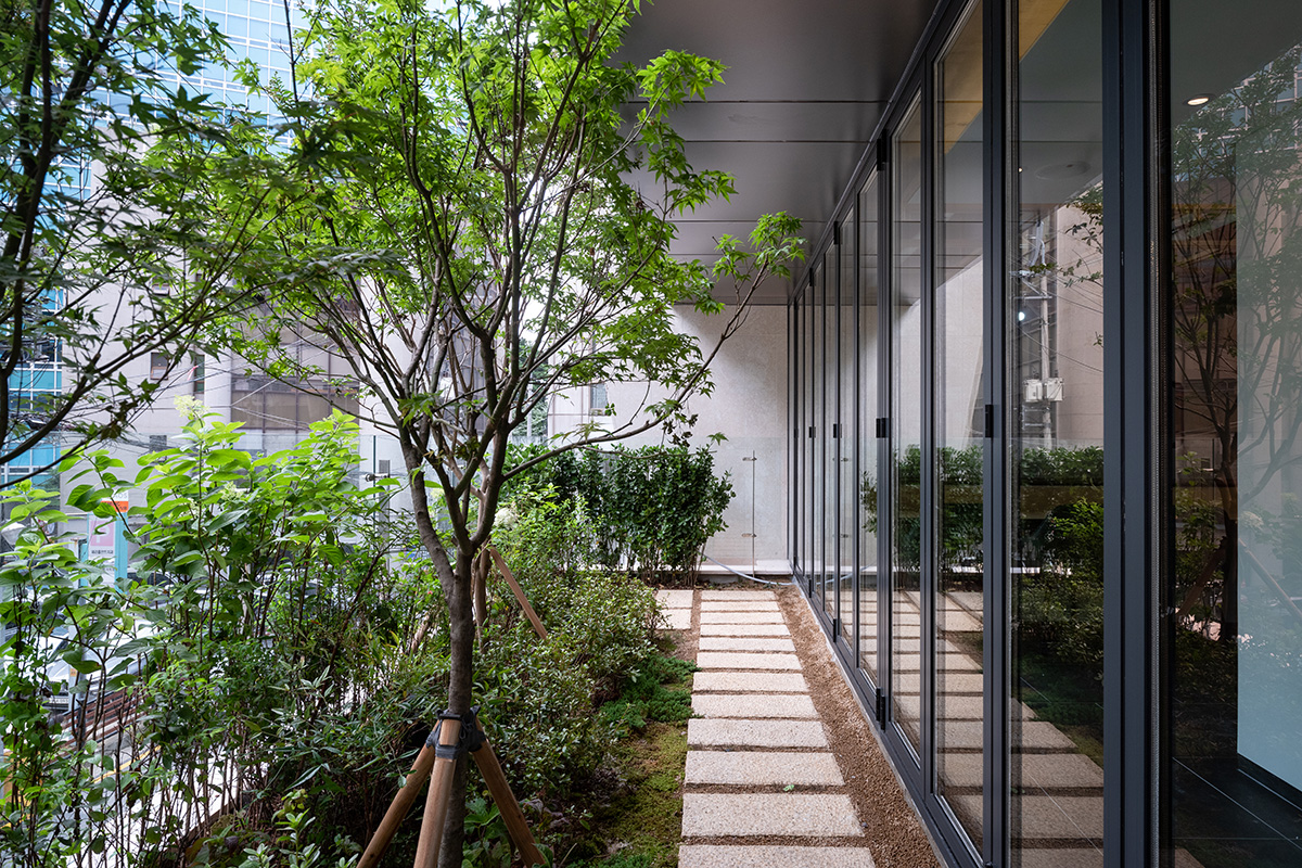 The green space on the second-floor continues to the roof. Since this space, built on the top floor, was planned to be used as the client’s personal work space, it was made to seem like an independent building built on a separate site as much as possible. When leaving the elevator on the 11th floor, the outside scenery can be seen throuth a vertically long window at the left end of the staircase. The door that is encountered when turning to the right leads to a exterior space facing the outside air. It was made to feel like entering a separate space. When opening another door, the main space is accessed through the corridor. A folding door was installed in the corridor so that it could be connected to the exterior garden, and a wooden porch was placed to allow one to sit and admire the small garden. After passing through the corridor and entering the main space, the entire city landscape can be seen through the open window wall. In front of it is a small garden that also serves as a balcony. The U-shaped garden surrounds the top floor with the intention of reviving the external space that was lost as the building filled the land.