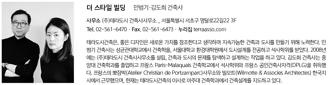 | 더 스타일 빌딩 설계자 | 민범기 · 김도희 _ (주)테라도시 건축사사무소 건축주 | 비공개 감리자 | (주)테라도시 건축사사무소 시공사 | 예미종합건설(주) 설계팀 | 고서경, 임수연 설계의도 구현 | (주)테라도시 건축사사무소 대지위치 | 서울특별시 서초구 서초대로51길11 주요용도 | 업무시설, 근린생활시설 대지면적 | 275.30㎡ 건축면적 | 153.01㎡ 연면적 | 1,644.87㎡ 건폐율 | 55.58% 용적률 | 499.66% 규모 | B2F - 11F 구조 | 철근콘크리트구조 + 라멘구조 외부마감재 | THK30오만석, THK24로이복층유리, 알루미늄패널, 징크패널 내부마감재 | 자기질타일, 화강석, 수성페인트 설계기간 | 2019. 04 – 2019. 12 공사기간 | 2020. 01 – 2021. 05 사진 | 이병근 구조분야 | 아림구조엔지니어링 기계설비분야 | 영동설비기술사사무소 전기분야 | 원이엔씨 소방분야 | 영동설비기술사사무소, 원이엔씨 |
