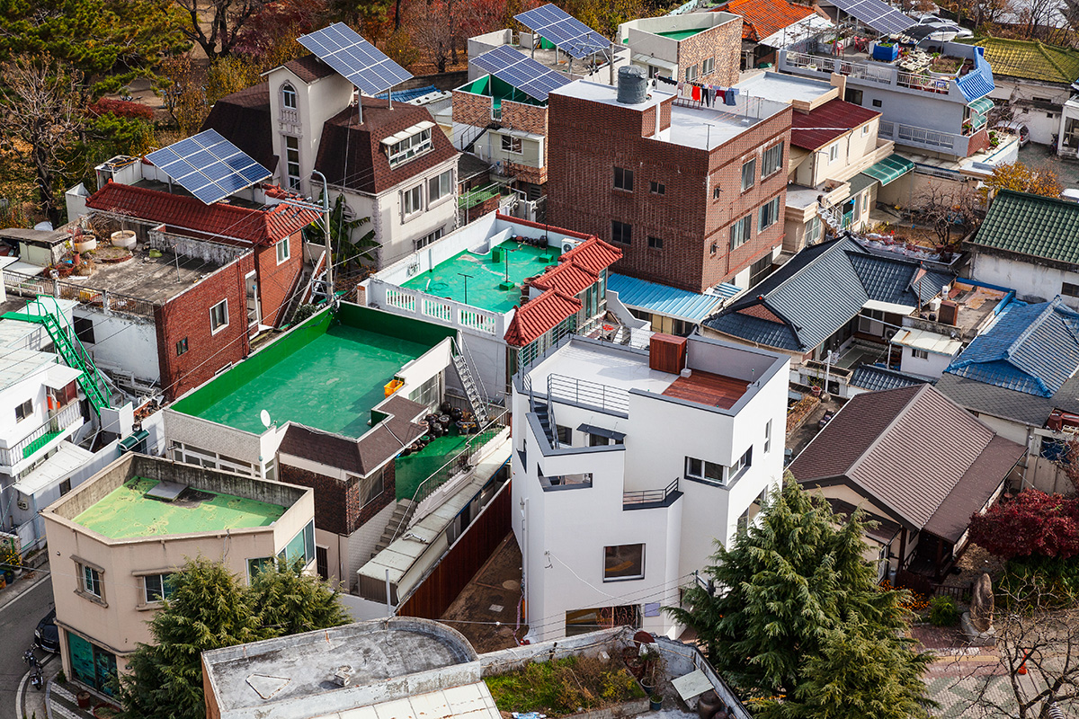 건축주는 공동주택을 벗어나 새로운 일상을 꿈꿨고, 그 필수 조건은 가족들 혹은 지인들과 함께 할 수 있는 외부공간이었다. 소규모 대지에서 지상의 마당은 사치스러운 공간이 되어버린 지 오래이다. 이 프로젝트 역시 약 129제곱미터(39평)의 부정형 대지에서 주차, 사무실, 마당을 함께 구성하는 건 불가능하여 옥상을 활용한 외부공간을 조성했다. 강아지의 영역인 3층 베란다와 옥상을 철제 계단으로 연결하고, 일조사선제한의 범위에서 최대한 옥상 벽체를 높여 외부의 시선에서 자유롭도록 배려했다. 옥상공간인 ‘하늘마루’의 바닥은 인조잔디와 목재데크를 적용하여 마당의 느낌을 연출하려 했다. 현재는 날씨가 좋은 날에는 사모님의 운동공간으로, 주말 저녁은 파티장으로 스케줄이 빼곡하다.