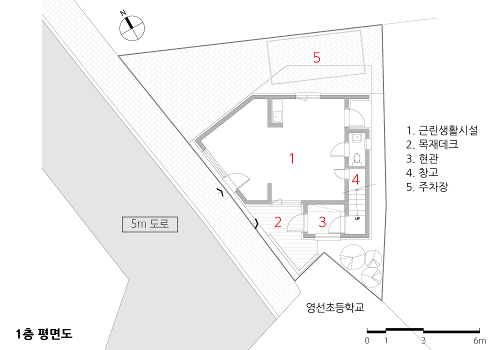 오랫동안 업무 관련으로 알던 분의 “건축사님, 이 땅 한번 봐주세요”라는 말에 업무 파트너에서 건축주와 설계자로 새로운 인연이 시작되었다. 작은 규모에 부정형의 대지 형상으로, 긴 시간 매물로 나와 있었지만 찾는 사람이 없던 땅이라 건축주가 원하는 집의 그림이 불가능할 것 같아 만류했으나, 단독주택 위주의 조용한 동네 분위기와 함께 남측으로 초등학교 운동장과 접해있어 자연채광에 유리한 점에 건축주가 후한 점수를 주어 나도 ‘애증의 관계’로 이 땅과 인연을 맺게 되었다.