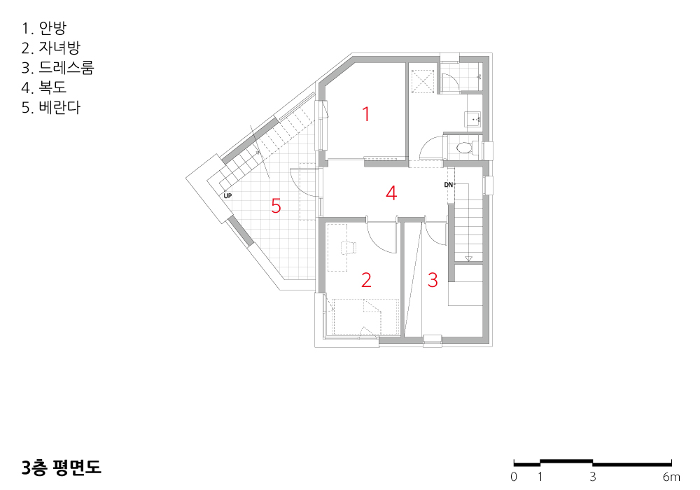 건축주는 3인 가족을 위한 주거공간과 개인 사무실을 계획하고 있었다. 1층은 사무실과 주차장, 주택의 현관으로 구성했으며 현관은 도로에서 최대한 이격하여 안전성을 확보하고 목재가벽과 목재데크로 주택의 영역성을 강조했다. 협소한 대지 규모로 인해 주거공간은 공간의 성격에 따라 2층은 거실과 가족실, 주방으로, 3층은 각자의 침실과 드레스룸, 욕실로 구성했다. 집에서는 주로 거실에서 함께하는 시간이 대다수여서 침실은 최소한의 공간만으로도 충분하다는 건축주의 의견이 있었기에 가능한 공간구성이었다.