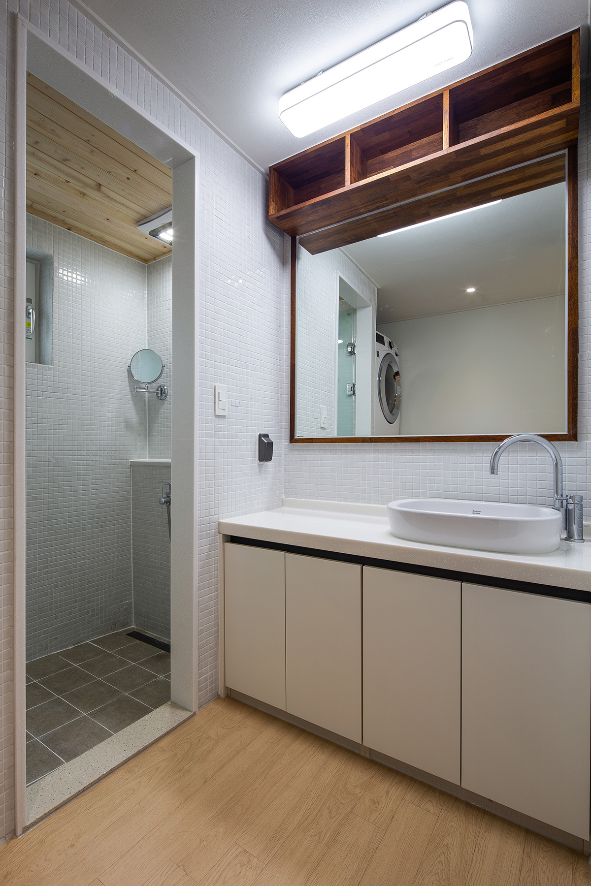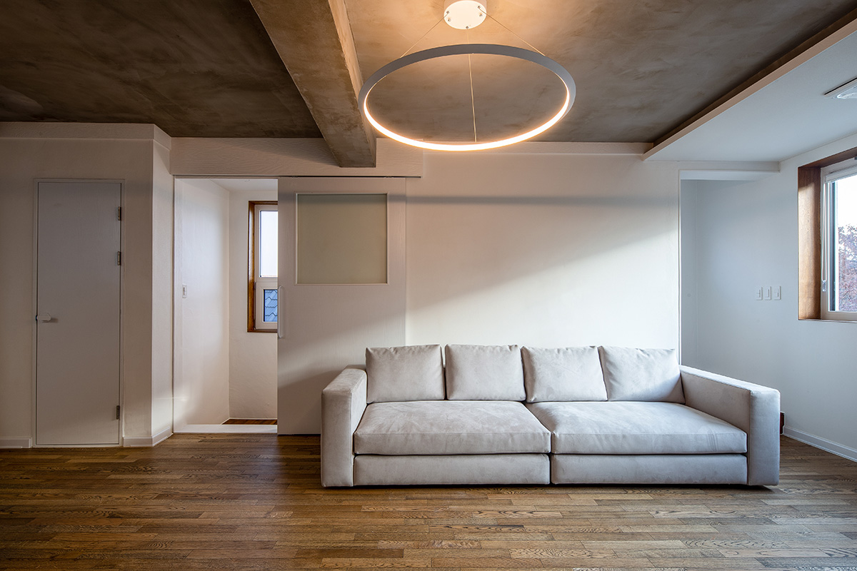 The client dreamed of a new daily life outside of the apartment complex, and an essential condition for that was an outdoor space where one could spend time with family or acquaintances. It has been a long time since the yard above ground became a luxurious space on a small plot of land. In this project, it was also impossible to organize parking, an office, and a yard together on an irregularly shaped site of about 129 square meters (39 pyeong), so an outdoor space was created using the rooftop. The third-floor veranda, which is the dog’s area, and the rooftop are connected by a steel staircase, and the rooftop wall is raised as much as possible within the scope of solar radiation restrictions to ensure freedom from outside views. The floor of ‘Haneul Maru’, a rooftop space, was designed to create the feeling of a yard by applying artificial grass and a wooden deck. Currently, the schedule is full as it serves as the wife’s exercise space on days when the weather is nice and as a party venue on weekend evenings.