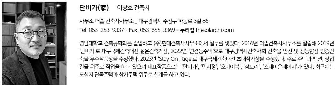 | 단비가(家) 설계자 | 이창호 _ 더솔 건축사사무소 건축주 | 김종우 감리자 | 임재훈 _ 우리 건축사사무소 시공사 | 건축주 직영 설계팀 | 정은지 설계의도 구현 | 더솔 건축사사무소 대지위치 | 대구광역시 남구 명덕로 52길 55 주요용도 | 단독주택 대지면적 | 129.00㎡ 건축면적 | 59.98㎡ 연면적 | 152.73㎡ 건폐율 | 46.50% 용적률 | 118.40% 규모 | 3F 구조 | 철근콘크리트구조 외부마감재 | 드라이비트 내부마감재 | 실크벽지, 원목마루 설계기간 | 2017. 11 – 2018. 03 공사기간 | 2018. 04 – 2018. 11 사진 | 윤동규 구조분야 | OS구조 기계설비분야 | 이도산업개발 전기분야 | 신라기술단 소방분야 | 신라기술단 |