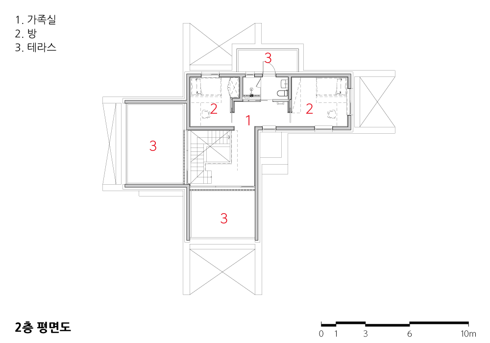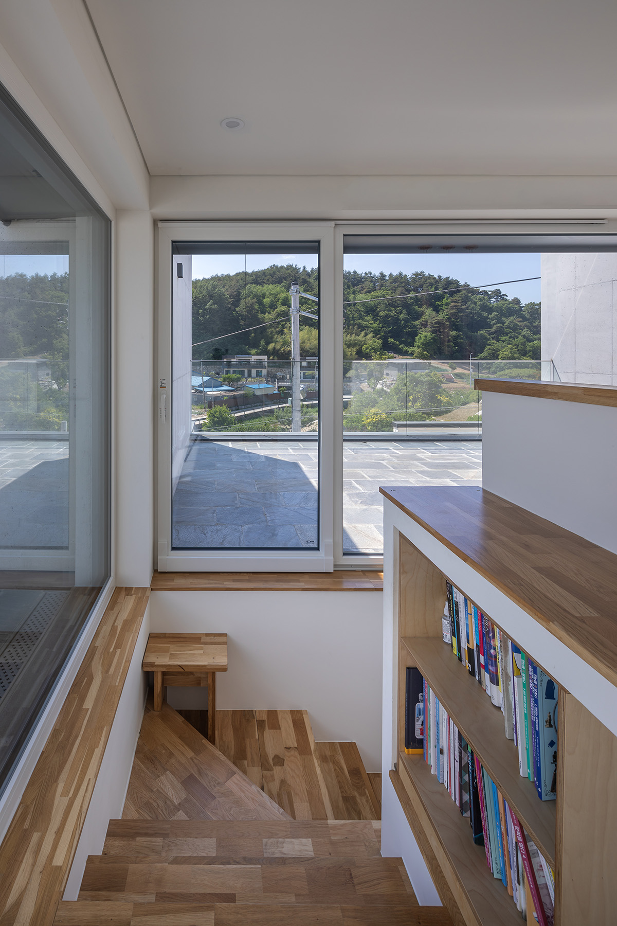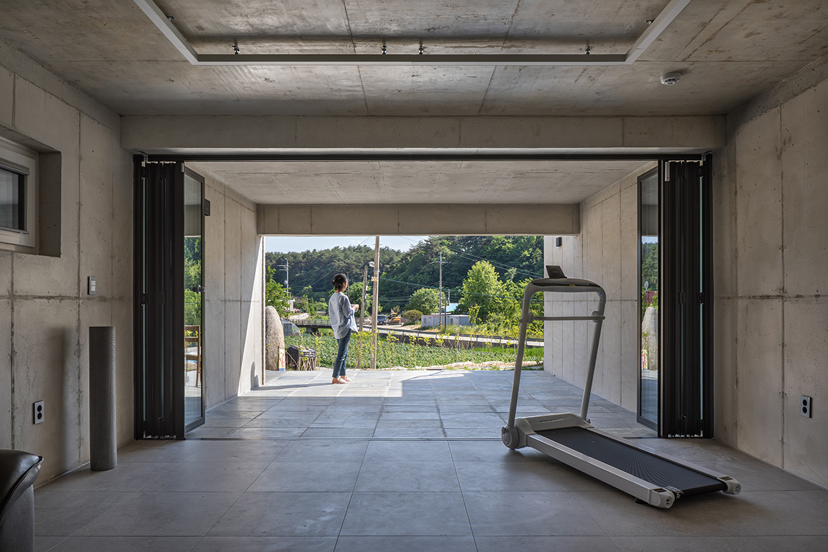 The first (ground) floor, including the living room and the kitchen, is frequently used by the family members, while the second floor includes the spaces for two children. As the uniform site belongs to the natural green area with the low building coverage ratio, there was not enough extra space for supplementary functions. Therefore, a portion of the southern stone foundation was removed to create a basement that, despite being underground, connects with the external air on one side, and a floor plate (pan) was lowered down to provide a view of Wichoncheon Stream and secure a multi-purpose workspace. The four outdoor yards and the balcony yards on each floor serve as playgrounds for the children and act as buffer spaces with neighboring residents. The interior structure connected and extended by the central staircase in all directions appears as vertical plates (pans) from outside, thus creating an open space that appears closed from outside.