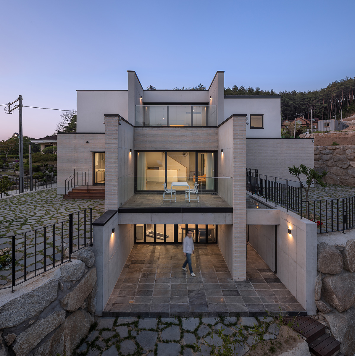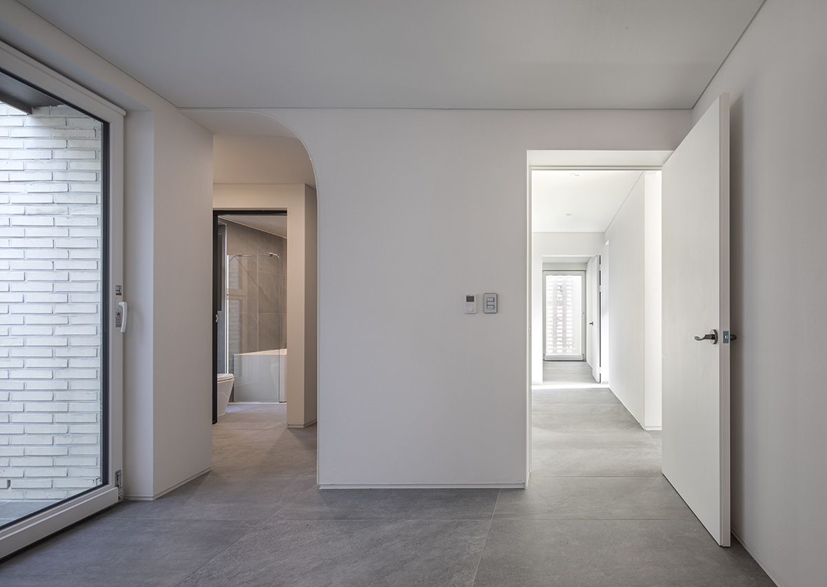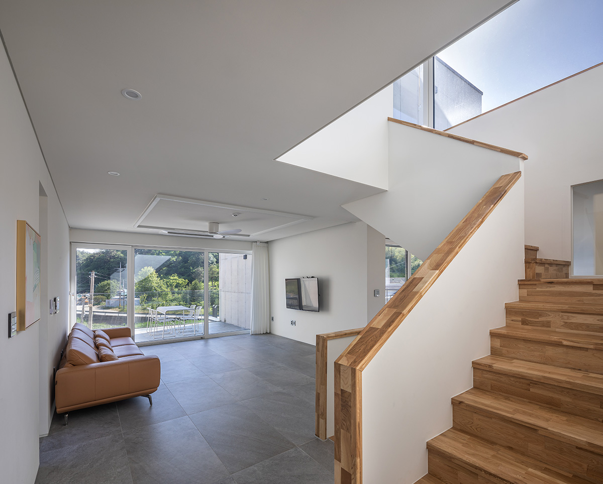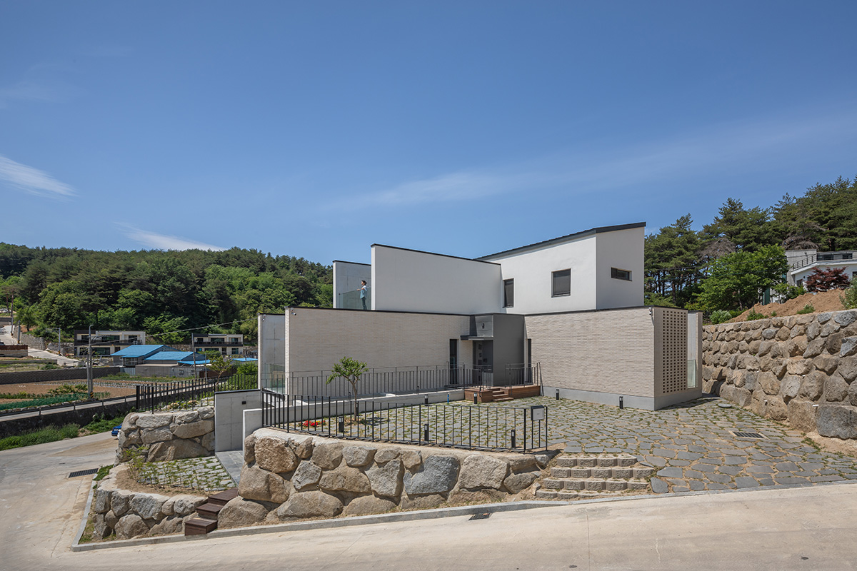 The site axis is west-oriented, but the building axis was turned to the south to design three outdoor yards in the front, rear, and kitchen areas. The south-oriented main axis of the building is the result of a choice to capture the flow of Wichoncheon Stream into the living room. The existing stone foundation limited the available space on the site, making it insufficient for a simple layout adhering to legal building coverage on a flat land. To secure the additional space required for the house, a portion of the stone foundation on the southern side of the site was removed, and the southern surface of the basement was opened to create an underground courtyard.