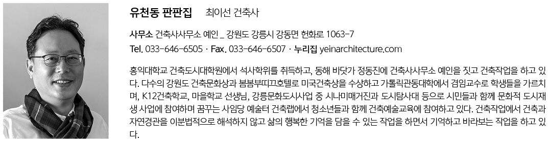 | 유천동 판판집 설계자 | 최이선 _ 건축사사무소 예인 건축주 | 박가린 감리자 | 최이선 _ 건축사사무소 예인 시공사 | (주)오케이종합건설 설계팀 | 이명선, 박지은 대지위치 | 강원특별자치도 강릉시 상유천길 26-7 주요용도 | 단독주택 대지면적 | 546.00㎡ 건축면적 | 108.56㎡ 연면적 | 222.39㎡ 건폐율 | 19.88% 용적률 | 29.13% 규모 | B1F - 2F 구조 | 철근콘크리트구조 외부마감재 | 알레스카미장화이트(코코세라믹.주), 코르텐강, 스터코플렉스 외단열시스템 내부마감재 | 지정벽지, 수성친환경 도장(KCC), 포세린타일 설계기간 | 2021. 03 ~ 2021. 06 공사기간 | 2021. 08 ~ 2022. 03 사진 | 윤준환 구조분야 | (주)나라구조엔지니어링 기계설비분야 | (주)이엘이엔지 전기분야 | (주)이엘이엔지 소방분야 | (주)이엘이엔지 |