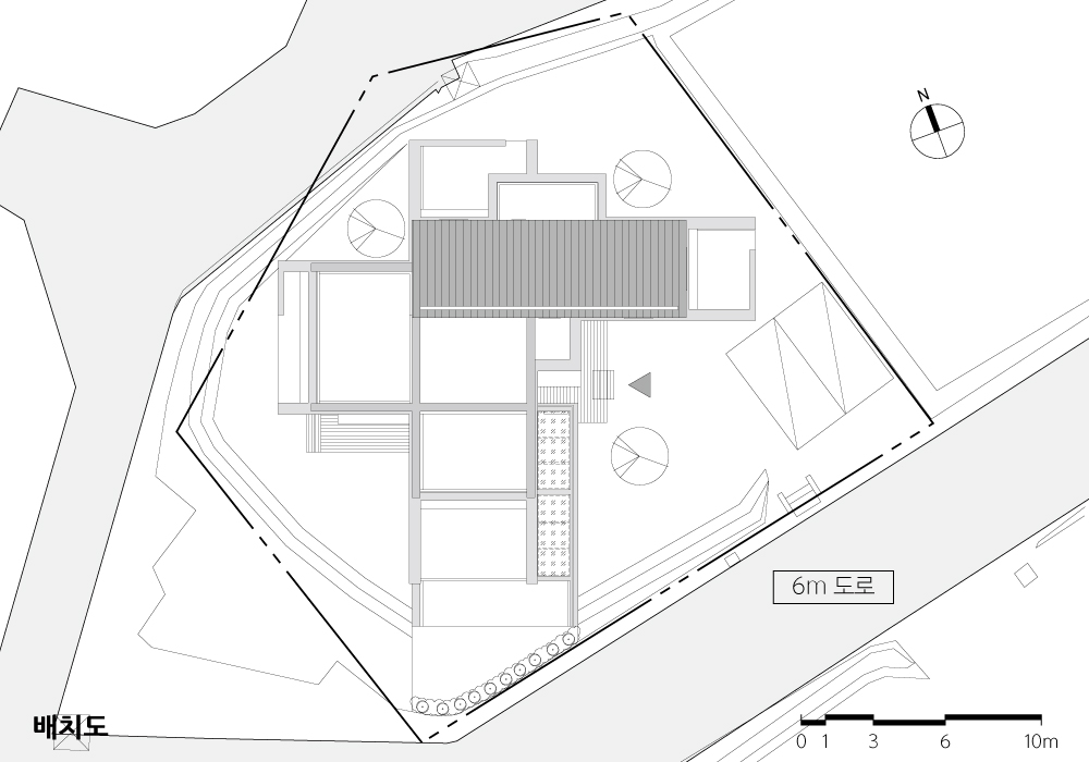 대지의 축은 서향이지만 건축물의 축을 남향으로 비틀어 3개의 외부마당 앞·뒤 그리고 주방 마당을 만들었다. 건축물의 주 방향은 남향으로 거실에서 위촌천이 흘러들어오는 방향을 선택했다. 석축이 축조되어 평평한 대지에 단순히 건폐율에 맞추어 배치하기에 대지는 협소했다. 주택에서 확보되어야 하는 부가적 공간을 만들기 위해서 대지의 남측 석축 일부를 제거하고 지하층 공간의 남측면을 틔워 다시 지하 마당을 만드는 작업을 했다.