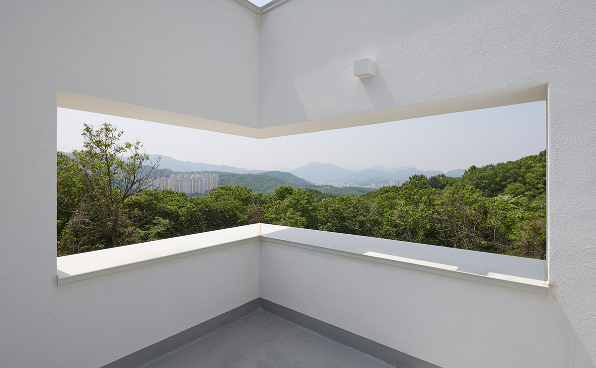다락방 한쪽에는 가족만을 위한 외부공간인 옥상마당으로 갈 수 있는 문이 있다. 안방 위에 있는 옥상마당은 높은 난간 벽과 액자 프레임처럼 열린 개구부를 두어 외부 풍경이 더욱 극적으로 보인다. 액자 같은 개구부는 마당이나 테라스에서 펼쳐진 풍경과는 또 다른 풍경을 보게 해준다. 외부 시선으로부터 온전히 자유로우면서, 연출한 듯 담긴 풍경을 관망할 수 있는 곳이 된다.