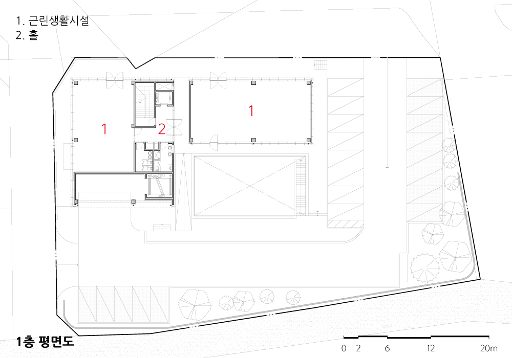 약 1984제곱미터(600평)라는 광활한 대지를 접하는 순간, 어떻게 ‘공간’으로서 대지를 점유하고 뿌리내리게 할 것인가에 대한 영감을 받았다. 단일 매스로 독존하는 것이 아닌, ‘비어진 공간’을 지상과 지하에 마련해 대지와 건축과 그 안을 관통할 삶의 이야기(프로그램, 동선)들을 날줄과 씨줄 삼아 엮어낼 수 있는 중심공간을 마련하고자 했다.