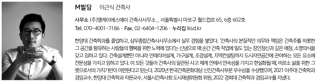| M빌딩 설계자 | 이근식 _ (주)엘케이에스에이 건축사사무소 건축주 | 주식회사 메디풀 감리자 | 조완형 _ 완성 건축사사무소 시공사 | (주)예승건설 설계팀 | 김동현, 문태석 설계의도 구현 | (주)엘케이에스에이 건축사사무소 대지위치 | 인천광역시 계양구 경명대로 958 주요용도 | 근린생활시설 대지면적 | 2,008.50㎡ 건축면적 | 401.00㎡ 연면적 | 2,179.26㎡ 건폐율 | 19.97% 용적률 | 58.85% 규모 | B1F - 3F 구조 | 철근콘크리트구조 외부마감재 | 알루미늄 복합패널, 석재 내부마감재 | 석재, 수성페인트, 흡음텍스 설계기간 | 2021. 02 – 2022. 01 공사기간 | 2022. 06 – 2023. 08 사진 | 구의진 구조분야 | 제이더블유구조안전기술사사무소 기계설비분야 | 주성엠이씨기술사사무소 전기분야 | (주)엘림전설 소방분야 | (주)엘림전설 |