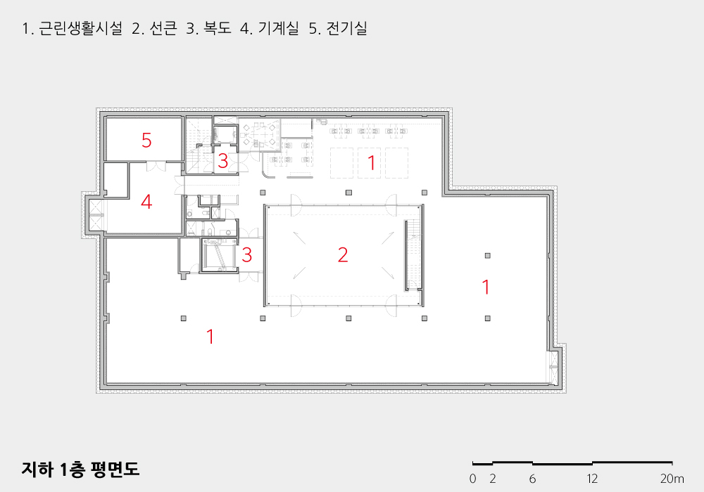 전 생애에 걸쳐 이어온 가업을 다음 세대에 전해주려는 아버님 건축주와, 그것을 소명처럼 받아들이는 아드님 건축주를 위한 사옥을 짓는 프로젝트에서, 앞으로 수많은 무형의 가치들을 담을 수 있는 여백의 공간을 두고자 하는 의지를 보이며 설득하는 일은 그리 어렵지 않았다. 경제적이지는 않을지라도 지하 중앙에 ‘썬큰 가든’을 마련해 지하 대공간이 따듯한 빛과 신선한 공기를 품을 수 있도록 하여 삶을 풍요롭게 만들고자 했다.