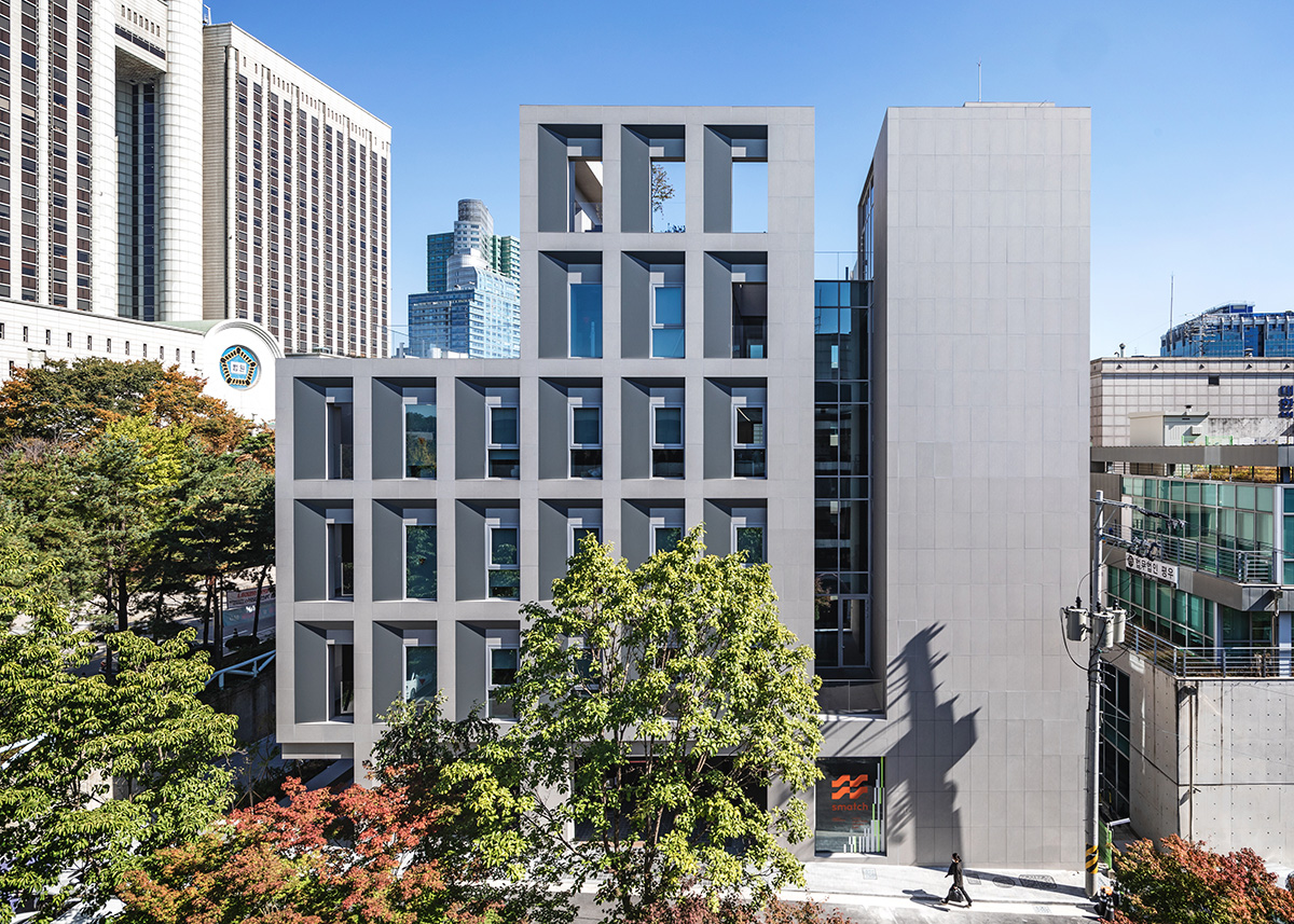 As you enter the area of the KL Building within the bustling urban landscape of Seocho-dong’s legal district, the once dizzying sight transforms into a space of simplicity and solidity. The surrounding noise is organized into the soothing sound of flowing water from the wall fountain. From the balconies extending from each floor’s office space (served space), one can enjoy views of the expansive Seoripul Park to the north and face the facade of the courthouse designed by Master Kim Soo-geun. It is a moment of respite amidst the hustle and bustle of the city, entering into the essence of Seocho-dong’s “Naos” – its temple-like sanctuary.